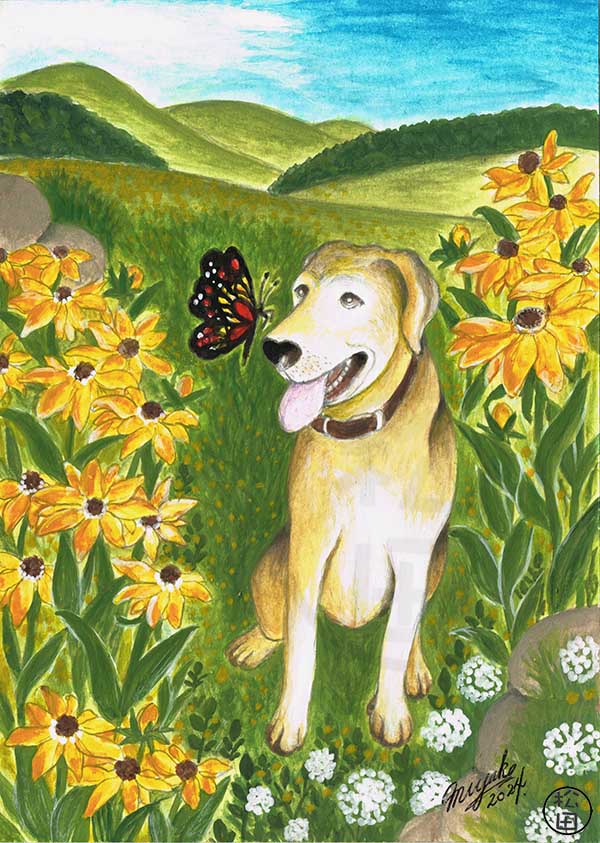 Dog with butterfly & Yellow Coneflower (Rudbeckie)