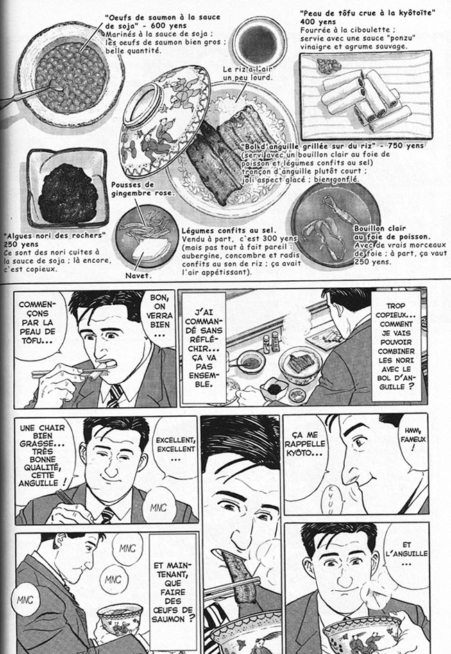 C’est un manga qui se lit plutôt bien, puisqu’on peut s’arrêter à volonté à la fin de chacune des courtes histoires; on peut le savourer tranquillement et à répétition. Comme la bonne bouffe, c’est un plaisir simple, contemplatif, qui nous offre l’occasion de méditer sur la relation avec notre propre environnement, au détour d’un repas, d’un quartier ou d’une rencontre. La description des lieux et des plats est si précise que je me demande si, en fait, chacune des histoires n’est pas la critique gastronomique de restaurants qui existent réellement…