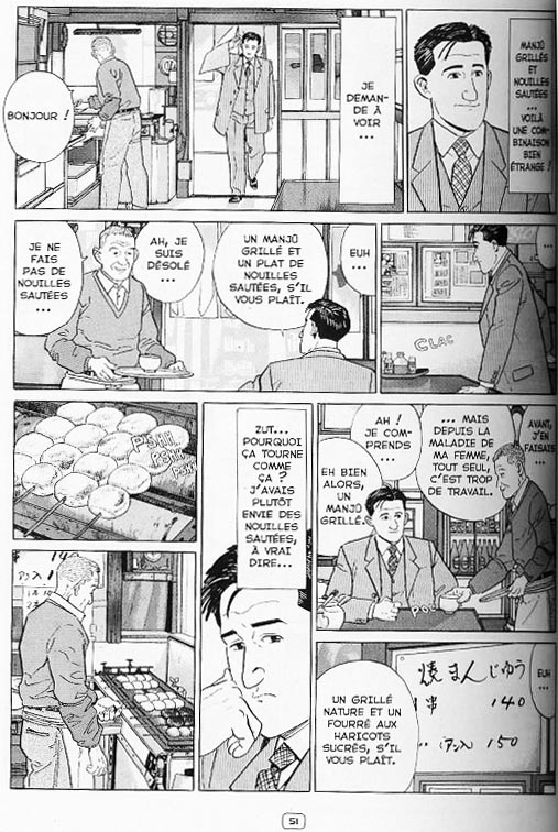 Le Gourmet solitaire [孤独のグルメ / Kodoku no Gurume] est un manga gastronomique qui nous fait découvrir, en dix-huit histoires très courtes (8 pages chacune), non seulement la cuisine Japonaise (qu’il s’agisse de porc sauté ou d’un bol d’anguilles grillées, de tokoyaki ou de yakiniku, d’oden ou d’udon) mais également plusieurs quartiers de Tokyo (ou même d’ailleurs: Gunma, Osaka, Kawasaki, Kanegawa). Encore une fois, Taniguchi nous dresse tout un panorama de la société nippone. Dans chacune des histoires, le narrateur sort d’une réunion d’affaire et, comme il a faim, il marche dans un quartier pour faire la découverte d’un restaurant et de plats qu’il nous décrit avec précision, le tout assaisonné de souvenirs ou de réflexions évoqués par la situation. C’est donc malheureusement assez répétitif, mais c’est tout de même une lecture agréable — à petite dose.