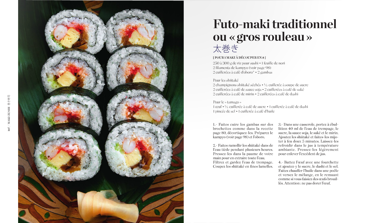 La quatrième chapitre est dédié au Gunkan-Maki (de curry thaï, d’oeufs de saimon, d’oeufs de lompe, de fromage de chèvre, de fraise et mangue). Le cinquième chapitre nous offre des recettes de Oshi-Zushi ou sushi-pressé (de maquereau mariné, d’anguille en kabayaki et de saumon fumé). Le sixième chapitre est, quant à lui, consacré aux Chirashi & Mushi-Zushi (Tekka-don, Chirashi d’oeufs de truite, de steak grillé, traditionnel de Kyoto, Mushi-zushi chaud au poulet et “tradition”). Après un dernier chapitre intitulé “Etc” (sur les Témari-zushi de thon, saumon, bar et salade de sashimi), le livre conclut avec une webographie offrant quelques bonnes adresses où trouver les outils et ingrédients (seulement en France, malheureusement), de courtes notices biographiques des auteurs, illustrateurs et photographes, ainsi que de brefs remerciements.