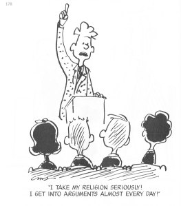 While reading the Peanuts cartoons I had already noticed that it often had religious themes, which I thought normal considering that the average american is much more outspoken and devout about his religion than the people I know and keep company with here in Quebec. I don’t know anyone who quotes scriptures in a conversation or an argument! However, this religious thematic is totally omnipresent in Young Pillars. I was annoyed by this at first, thinking that Schulz must have been quite a devout american. But I quickly realized that he was often putting a slightly cynical twist in his story, gently pointing out how excessive the religious belief can be in the average american daily life. And THAT I liked.