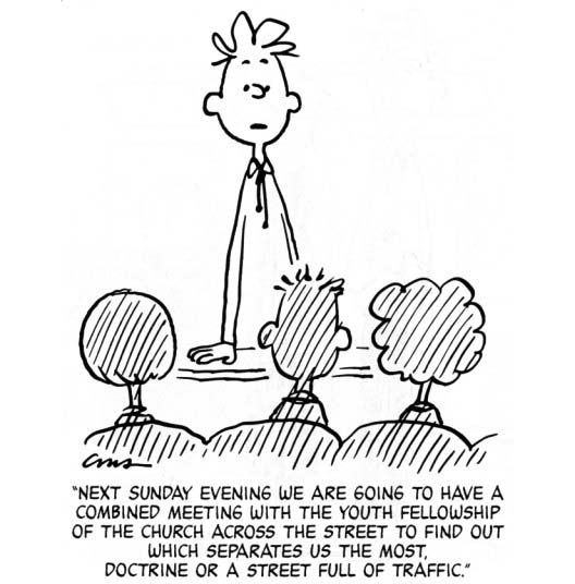 But this religious tone is no coincidence since the Young Pillars cartoon series was published in Youth magazine, which was a Warner Press publication aimed at teens in the Church of God, a Holiness religious movement headquartered in Anderson, Indiana (There are so many different sects, a.k.a denominations, in the Christian faith that it’s almost ridiculous!). The single panel series ran, first bi-weekly and later weekly, from January 1st 1956 until early 1965. This book also includes illustrations that Schulz did for the 22nd International Youth Fellowship convention, for Two-by-Fours (a short book by Kenneth F. Hall about the place of preschool-aged kids in the church published in 1965 by Warner Press) and for the monthly magazine Reach (1969). The book concludes with an article about Schulz’s Warner Press work. The Young Pillars cartoons were often reprinted in Youth magazine and syndicated to other publications. There were also compiled in various books: Young Pillars, Teen-Ager is Not a Disease, What Was Bugging Ol’ Pharaoh, Teen-agers Unite, I Take my Religion Seriously and, of course, Schulz’s Youth.