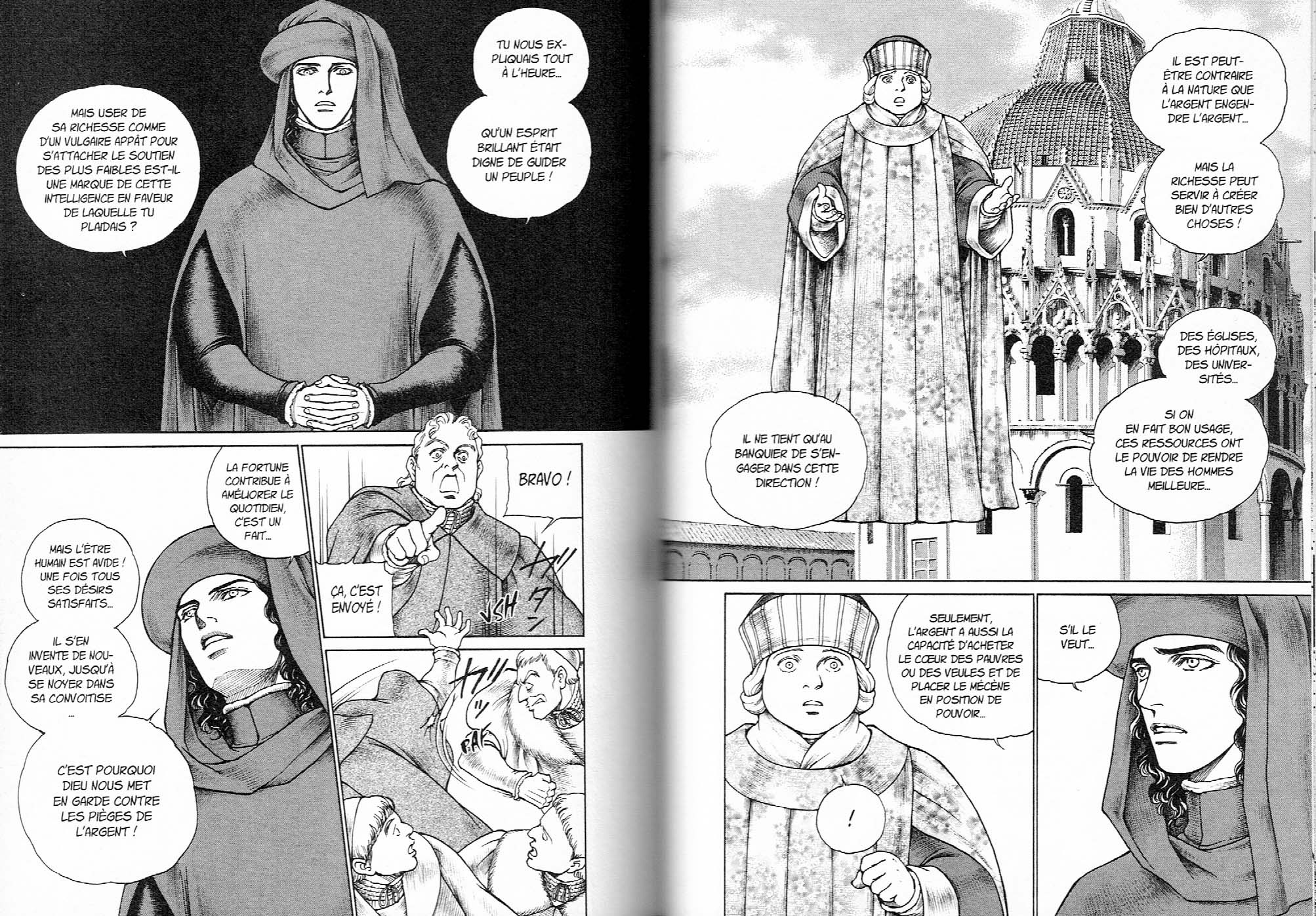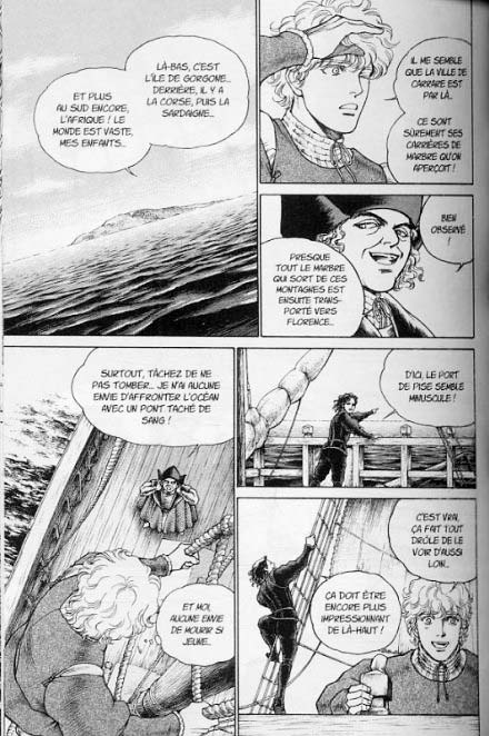 Il ne se passe pas grand chose dans ce volume, essentiellement consacré à l’examen de Giovanni et aux adieux d’Angelo. L’action prend une pause pour un moment de réflection et pour clore un chapitre du récit. Si je ne savais pas qu’il y a au moins un autre volume (et que vraisemblablement la série se poursuit) j’aurais pu même croire que ce volume est la fin de l’histoire. Mais il semble bien que les aventures de Cesare (et d’Angelo on l’espère) se poursuivent au-delà de Pise. Malgré le manque d’action on ne s’ennui pas vraiment dans ce volume. Je dois toutefois admettre que le récit progresse plutôt lentement et, le rythme de publication (au Japon) étant de surcroit assez lent (avec en moyenne un volume par année), il faut vraiment être patient pour apprécier cette série. Toutefois cela en vaut vraiment la peine. Je recommande encore et toujours cet excellent manga. J’ai d’ailleurs bien hâte de voir quelle direction l’histoire va prendre dans le prochain volume.
