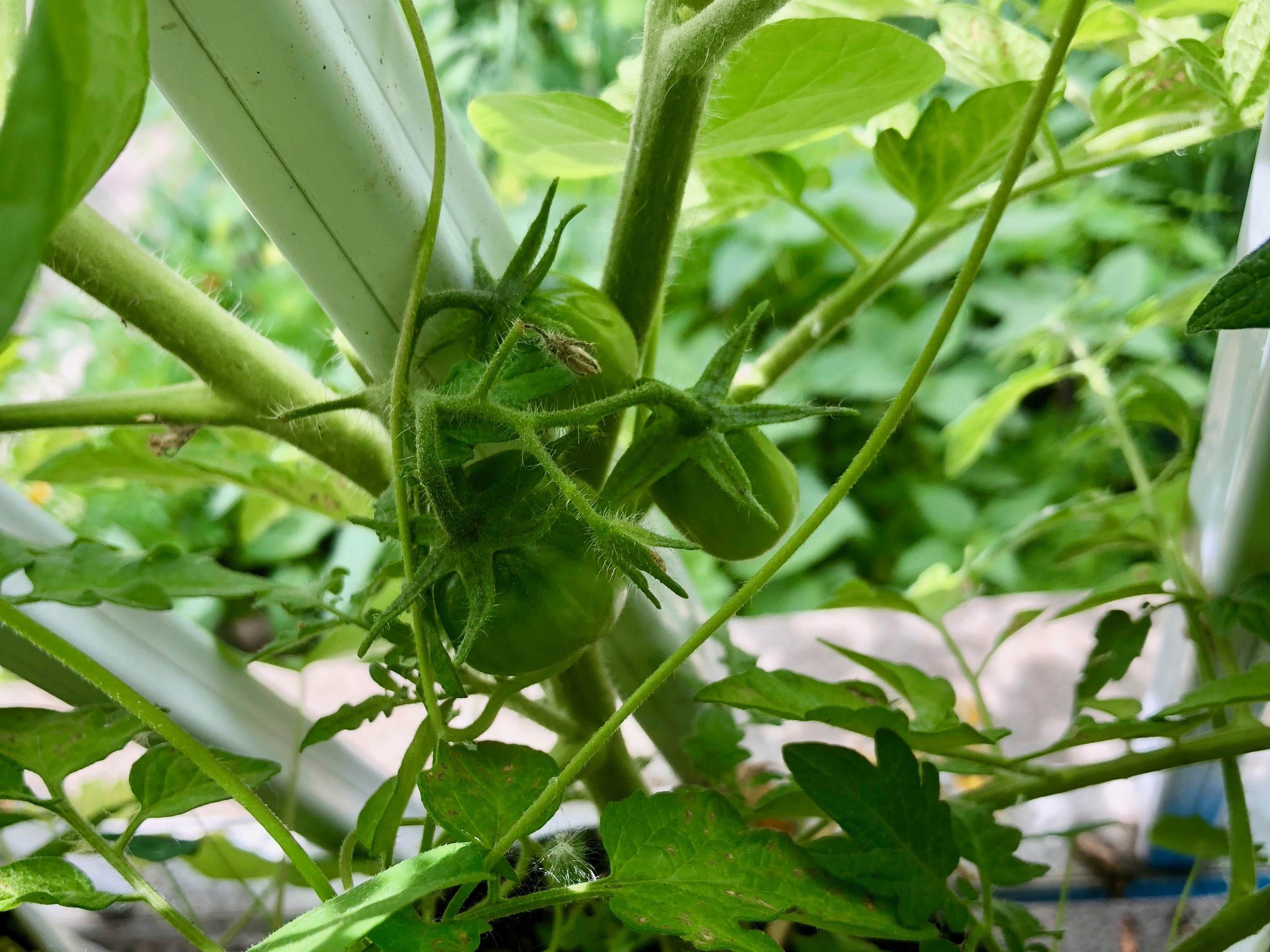 La plupart des plants de tomates sont sur le balcon avant pour des raisons d’ensoleillement. Il y retrouve déjà quelques petites tomates cerises…