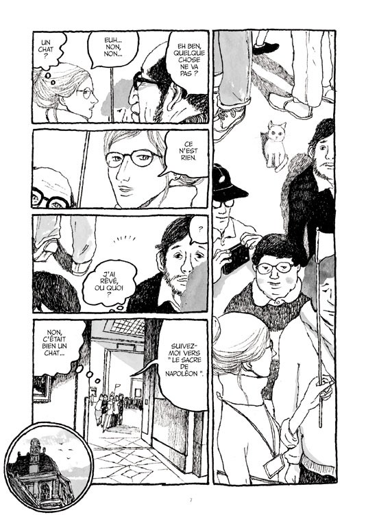 J’étais donc plutôt hésitant à me lancer dans la lecture des Chats du Louvre. Toutefois, après l’avoir feuilleté un peu, je me suis rendu compte que, dans ce cas-ci, son style n’est pas aussi laid que d’habitude. En fait, j’y trouvais même une certaine douceur. Il n’utilise son style brouillon, ses perspectives bizarres et la violence que lorsqu’il nous présente le point de vu des chats, qui sont alors anthropomorphisés (j’aime d’ailleurs bien l’araignée qui a un look très Polnareff). Le récit est très intéressant et constitue une lecture agréable.
