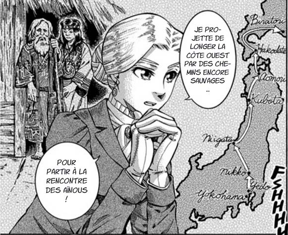 “À la fin du XIXe siècle, le Japon s’ouvre au monde et s’occidentalise à marche forcée. Mais le pays reste un vrai mystère pour la plupart des Européens, ce qui en fait une destination de choix pour la célèbre exploratrice anglaise Isabella Bird ! Malgré son jeune âge, elle est déjà connue pour ses écrits sur les terres les plus sauvages. Isabella ne choisit jamais les chemins les plus faciles et, cette fois encore, elle étonne son entourage par son objectif incongru : Ezo, le territoire des Aïnous, une terre encore quasi inexplorée aux confins de l’archipel… Le voyage s’annonce long et difficile, mais rien n’arrête la pétillante jeune femme !