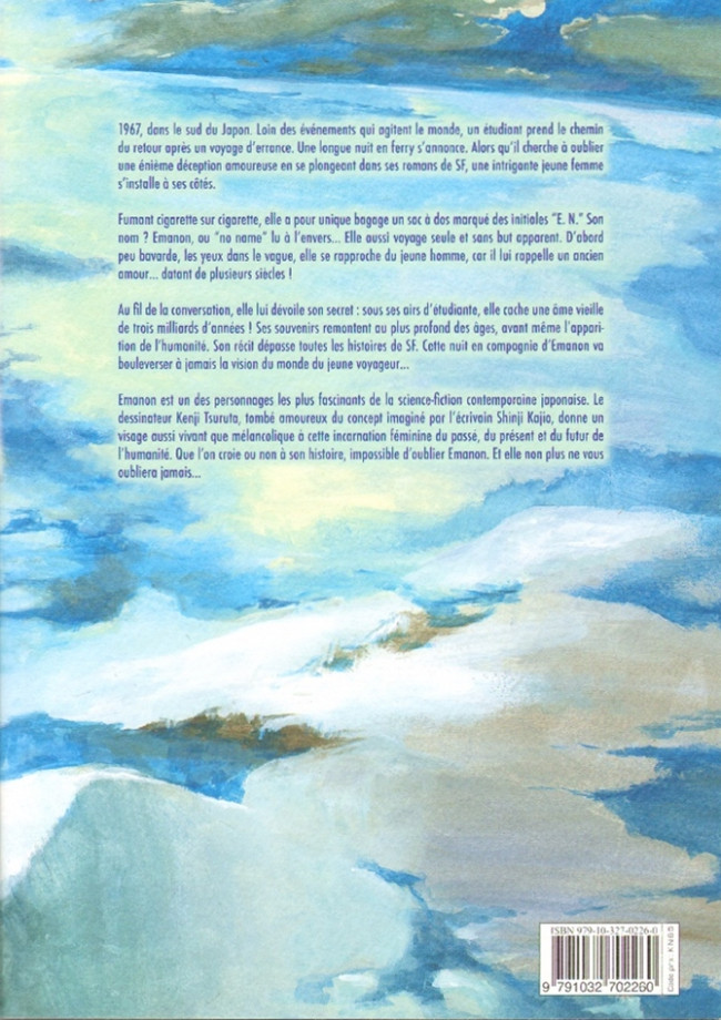 Emanon est un des personnages les plus fascinants de la science-fiction contemporaine japonaise. Le dessinateur Kenji Tsuruta, tombé amoureux du concept imaginé par l’écrivain Shinji Kajio, donne un visage aussi vivant que mélancolique à cette incarnation féminine du passé, du présent et du futur de l’humanité. Que l’on croie ou non à son histoire, impossible d’oublier Emanon. Et elle non plus ne vous oubliera jamais…”