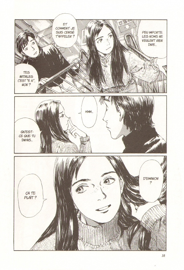 Fumant cigarette sur cigarette, elle a pour unique bagage un sac à dos marqué des initiales “E. N.” Son nom ? Emanon, ou “no name” lu à l’envers… Elle aussi voyage seule et sans but apparent. D’abord peu bavarde, les yeux dans le vague, elle se rapproche du jeune homme, car il lui rappelle un ancien amour… datant de plusieurs siècles !