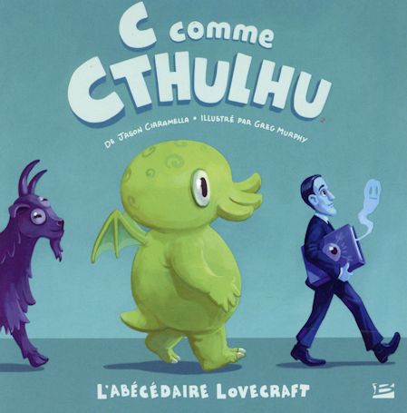 C comme Cthulhu : l’abécédaire Lovecraft, écrit par Jason Ciaramella et illustré par Greg Murphy (traduit par Alain Névant). Paris: Bragelonne, novembre 2016. 26 pp. 14.90 € / $24.95. ISBN: 979-10-281-0152-7. Pour lectorat de 4 ans et plus (!).