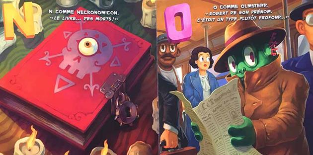 Avec C Comme Cthulhu, l’alphabet se décline selon l’univers de H.P. Lovecraft: Alhazred (l’auteur fou du Kitab al-Azif, a.k.a. Necronomicon), Bêêêêê (le cri présumé de Shub-Niggurath, la chèvre noire aux mille chevreaux), Cthulhu (l’inconcevable prêtre des Grands Anciens), Dagon (un autre Grands Anciens, dieu poisson), Écritures Ponapes (texte mythique de R’lyeh), Frissons, Goules, Hastur (un autre Grand Ancien tentaculaire), Innsmouth (ville du Massachusetts où se déroule les cauchemars), John Raymond Legrasse (un inspecteur dans L’Appel de Cthulhu), K’n-yan (territoire sous-terrain en Oklahoma), Lovecraft (Dâ!), Miskatonic (rivière maudite qui donne son nom à l’Université d’Arkham), Necronomicon (le livre occulte qui rend fou), Olmstead (Robert Olmstead, le narrateur dans Le Cauchemar d’Innsmouth), Providence (ville natale de Lovecraft), Q’yth-Az (l’Intellect Crystalloïde, un autre Grand Ancien), R’Lyeh (la cité engloutie), Shoggoth (monstres gélatineux créés par les Anciens), Tiare de Dagon, Ulthar (Contrées du Rêve, peuplée de chats), Vigilant, West (Herbert West, le réanimateur original), Xiurhn (serviteur des Outer Gods), Yog-Sothoth (le Gardien d’entre les Mondes), et finalement Zombies (eh, y-a pas de zombies dans la mythologie de Lovecraft!). Wow!