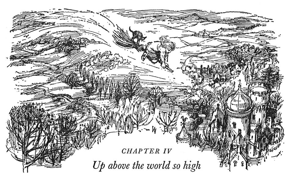 The next day, while trying to sweep up leaves in the courtyard with a broomstick too big for her, she discovers a little broomstick, just the right size for her. As she touches the little broomstick with her hands stained with the purple juice of crushed fly-by-night, the broomstick leap. Mary clings to it, trying to hold it between her legs, but it takes flight and bring her (and Tib) up in the sky, above the world so high! After crossing a thick fog, she finds herself in a strange place and lands near the Endor College for young witches. We meets Madam Mumblechook, the headmistress, and Doctor Dee. They think she’s a new pupil and she plays along (as “trespassers will be transformed”!). She visits the school, proves that she is a competent witch, steals a spell book and promises to come back for class the next morning. As she returns home, she realizes that Tib is missing.
