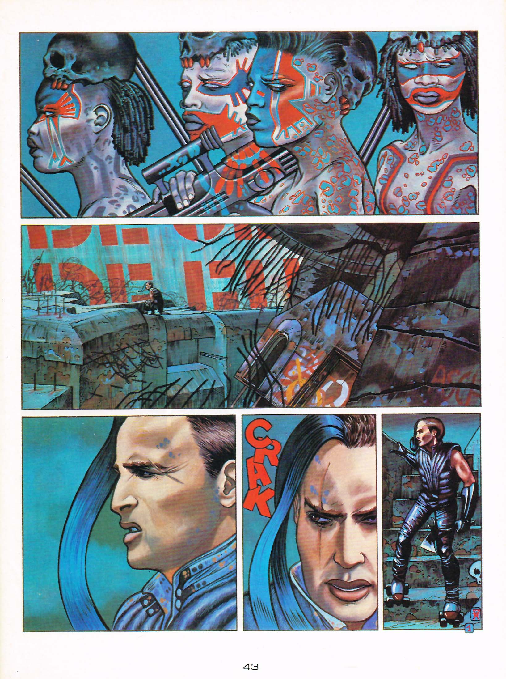 Le dernier truc de Philippe Gauckler que j’ai eu la chance de lire fut celui qui attira vraiment mon attention. Il s’agit de Blue, une adaptation d’un roman de Joël Houssin, publié au Fleuve Noir Anticipation (#1144, réédité avec une couverture de Gauckler en 1985) et scénario par Houssin lui-même. J’avais lu ce roman de violence post-catasclysmique et j’avais trouvé ça intéressant. Un tel univers, si sombre, dépeint par des couleurs vives et pures, avec un look qui se place entre Moebius et Bilal, là c’était carrément fascinant. Malheureusement, je n’ai jamais lu cette histoire au complet parce que c’était à l’époque où j’en avais ras le bol de Métal Hurlant…
