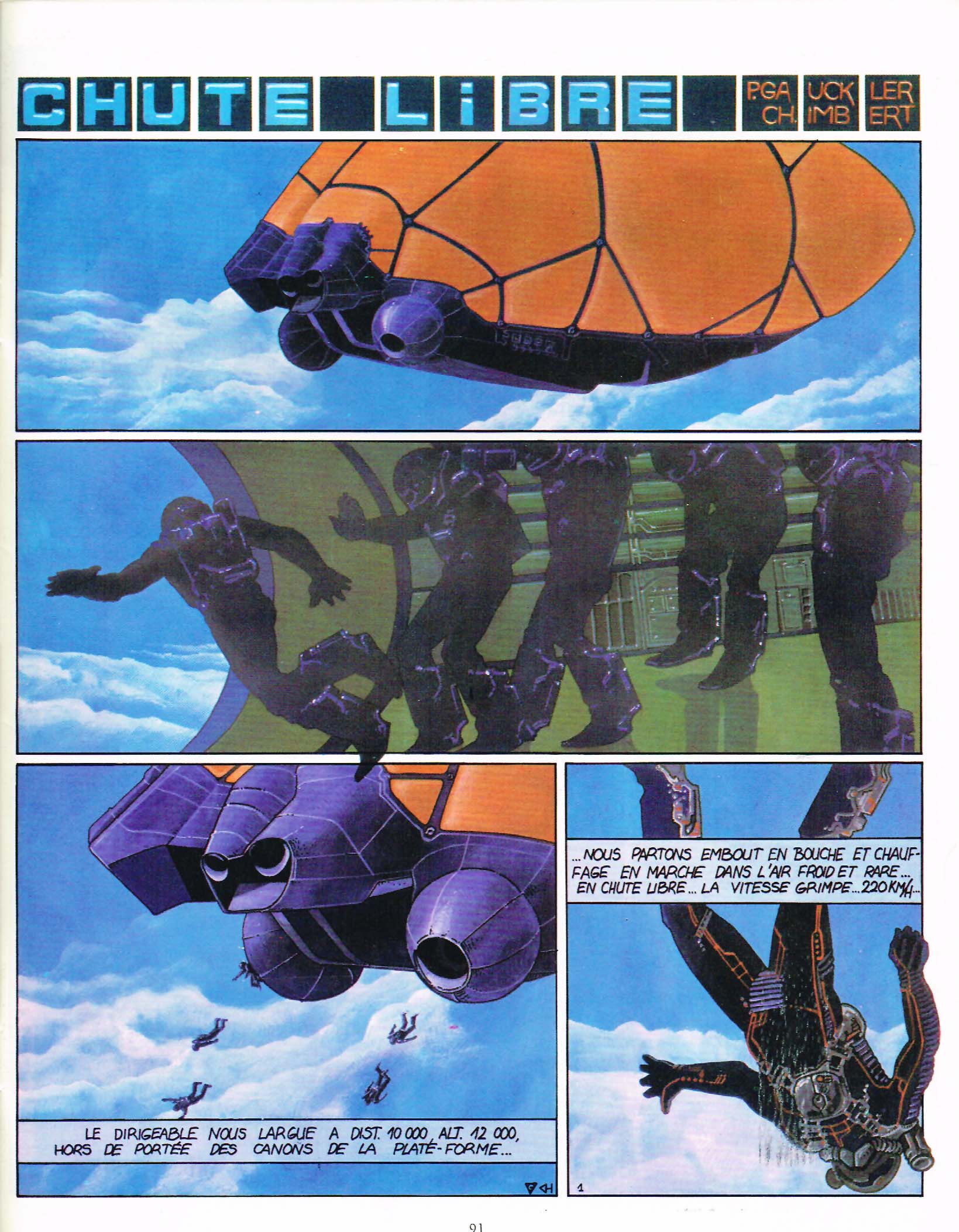 À ma connaissance, la première apparition de Gauckler dans Métal Hurlant s’est faite dans le #71 (janvier 1982, pages 91-98) avec une BD de huit page intitulée “Chute Libre” (texte: Charles Imbert, art: Philippe Gauckler). C’est une histoire courte à texte minimaliste, et de très belle illustrations. Chaque case est presqu’un tableau en soi. Mais si Gauckler montrait un grand talent d’illustrateur, il lui restait beaucoup de travail à faire, l’interaction entre le récit et l’image étant faible. C’est une histoire illustrée, pas de la BD.