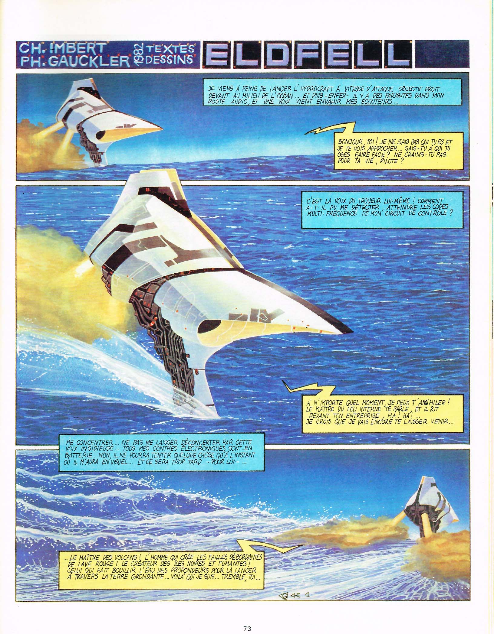 “Eldfell” (MH 83, p. 72, 10 pages) continue l’univers Air/Eau/Deux-Quart. C’est de mieux en mieux. Les trois personnages rencontrés dans les histoires précédentes sortent un peu de l’anonymat. On y retrouve des designs à la Chris Foss mais toujours cette “rigidité” dans le récit.