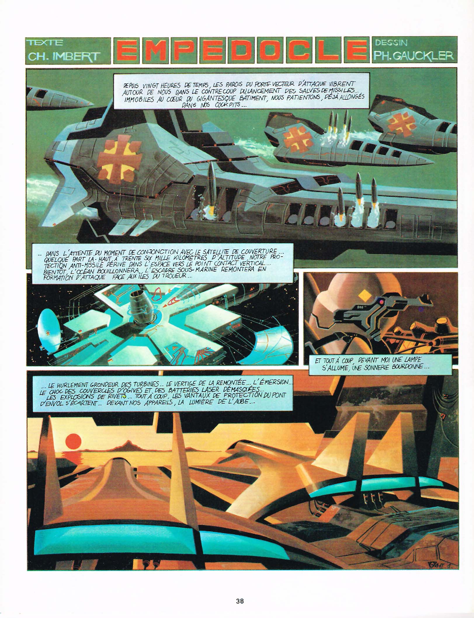 J’ai été très surpris par Convoi. D’abord par le fait que ce genre de de BD avait un très petit tirage (autour de cinq-mille, je crois), car j’ai toujours cru que le marché Européen était plus vaste que ça, pouvant théoriquement se permettre de plus gros tirage (bien sûr, pour un petit éditeur la prudence est de mise pour le tirage initial; mieux vaut réimprimer que piloner!). J’ai été surtout surpris par la qualité et l’intérêt que présente Convoi: c’est beau, c’est attrayant et l’histoire a beaucoup de coffre. J’ai été finalement surpris par ce nom, Gauckler, qui me rappelait vaguement quelque chose: je l’avais lu maintes fois, jadis, dans le magazine Métal Hurlant, avant que j’en abandonne la lecture (le magazine dérapait alors dans un style d’histoires qui ne me plaisait plus du tout). Si j’en avais retenu le nom, c’est que l’artiste devait être bon, mais je ne souvenais pas d’aucun titre d’histoire en particulier. Alors, j’ai ressorti ma collection de Métal Hurlant (les 110 premiers numéros) et j’ai relu l’oeuvre de Gauckler…