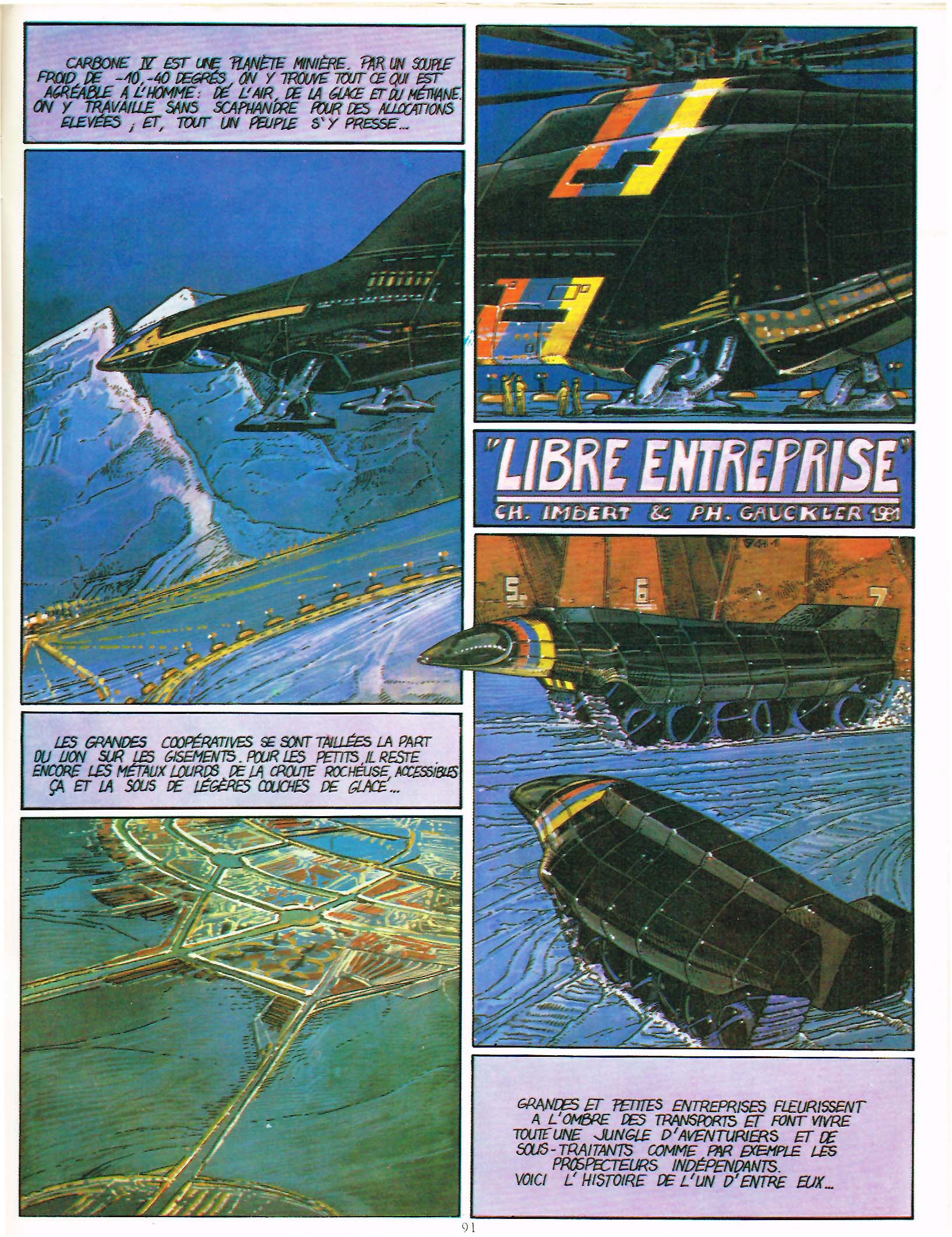 La deuxième histoire de Gauckler/Imbert, “Libre Entreprise”, apparait dans MH 73 (mars ’82, p. 91-98) et montre des améliorations. Un dialogue, malheureusement cryptique, est ajouté. Les personnages manquent de dynamisme, de personnalité. C’est superbe graphiquement mais on dirait que le récit est trop à l’étroit dans cette BD de six pages.