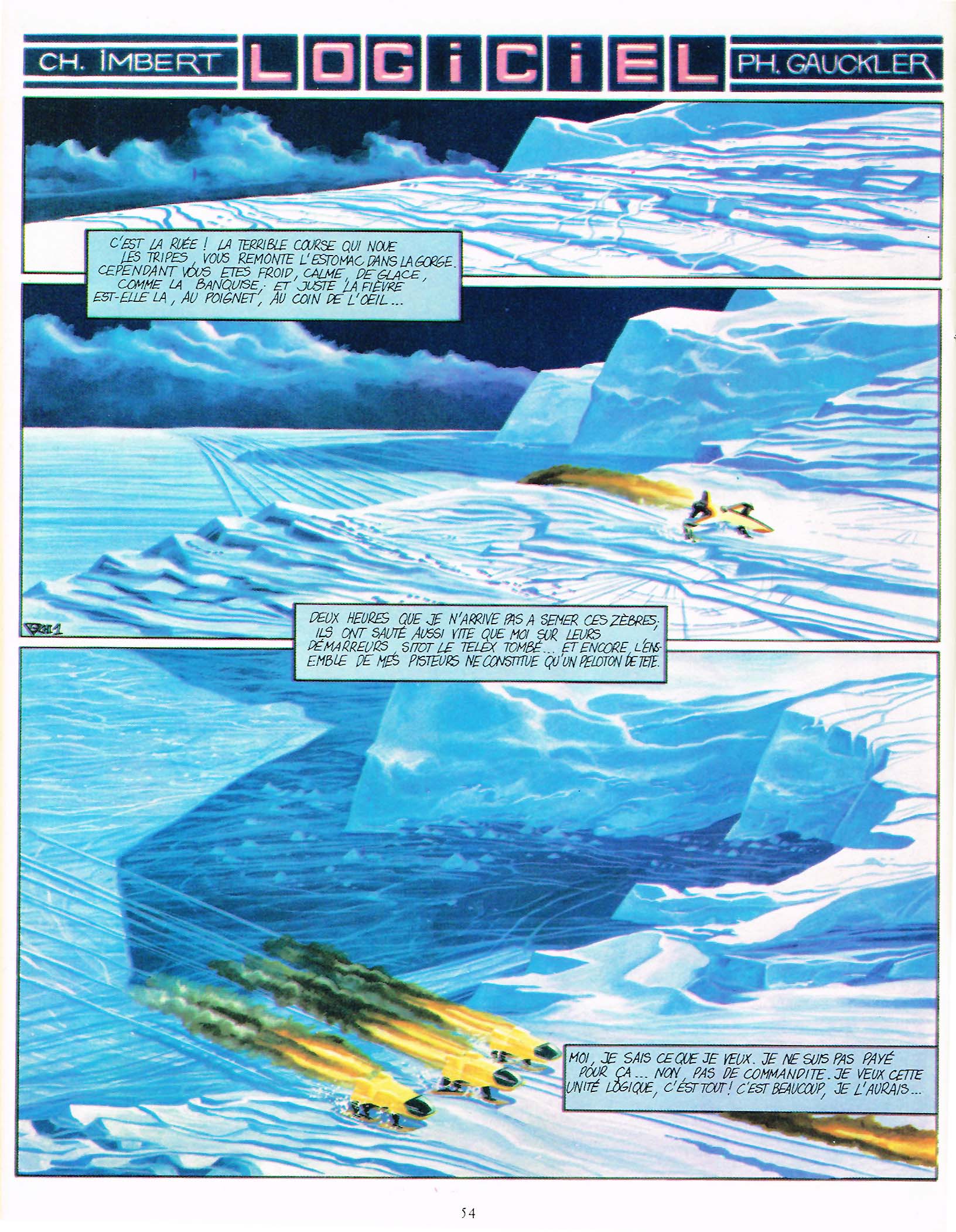 “Logiciel” (MH 77, juillet ’82, p. 54, 8 pages) par Gauckler/Imbert offre le même univers que la première histoire. Il s’agit du même type de récit illustré. L’ensemble doit faire plus de sens (peut-être ai-je manqué un épisode?). Gauckler a également réalisé la couverture de ce numéro.