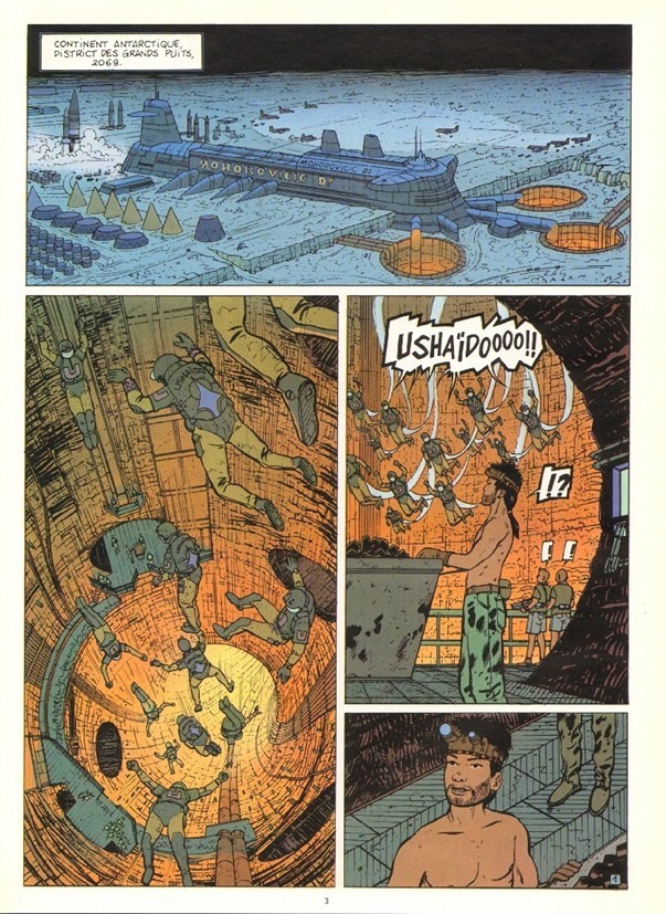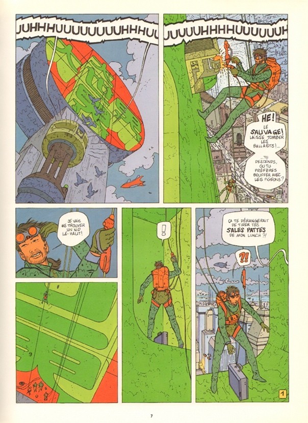 Du point de vue graphique, Gauckler prends un virage décisif en donnant à son style une facture plus classique (qui rappel un peu Mézières, mais surtout aussi beaucoup Leloup). Ses couleurs sont moins “crisp” et contrasté que dans Blue, et il adopte une palette plus pastel et un peu glauque. Les premières pages m’apparaissent un peu plus grossières, maladroites, mais il atteint rapidement une harmonie des couleurs plus agréable à l’oeil. Le choix de couleurs évoque un peu celles employées par Edgar P. Jacobs dans les aventures de Blake & Mortimer, mais leur application sans dégradé et le style graphique rappel beaucoup Moebius. L’action est plus fluide et est dorénavant orienté sur les personnages et non plus sur des designs mécaniques à la Chris Foss. C’est vraiment superbe. Et il y a beaucoup de petits détails innovateurs et originaux. Par exemple, j’ai bien aimé les petits logos qui apparaissent dans les cases chaque fois que l’on montre un gadget techno.