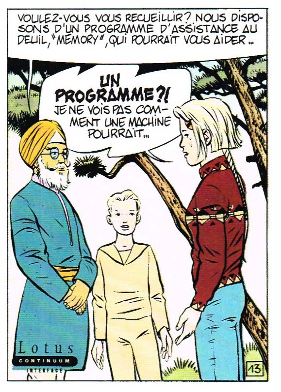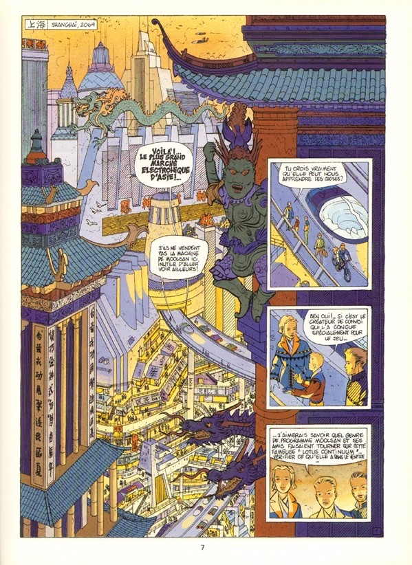 Pour Convoi, Gauckler travaille avec un nouveau scénariste: Thierry Smolderen. Celui-ci nous offre un récit de la trempe des bonnes vieilles BD de science-fiction, comme pouvaient en faire Christin ou Moebius, mais avec une touche plus moderne (pour les années ’90!). C’est une histoire très technologique et cyberpunk. Il y est question d’hologramme, de réalité virtuelle, et de réseau informatique. Le récit est complexe et mélange gros consortium technologiques et complots politiques. C’est difficile à résumer mais c’est génial. Je n’avais pas lu dix pages que j’étais totalement accroché. C’est une BD qui coule, toute douce, et dont on ne peut plus se passer une fois qu’on en a commencé la lecture.