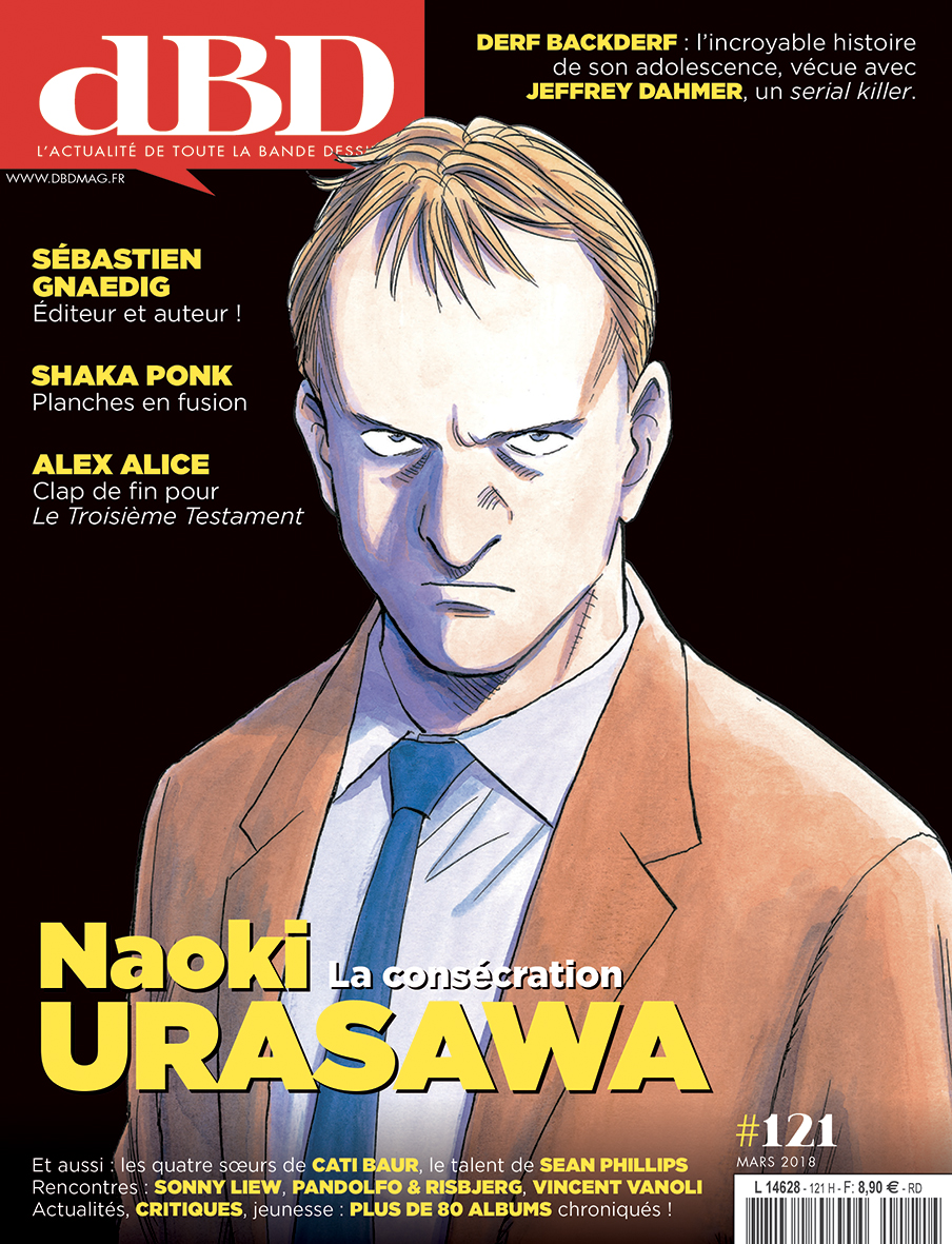 Dans ce cas-ci, dBD #121 a attiré mon attention à cause de sa couverture sur Naoki Urasawa (pour les détails sur le contenu, je vous renvoi au sommaire du numéro sur le site du magazine). Apparemment, c’est la première fois que dBD consacre sa couverture à un artiste japonais — et ce à l’occasion d’une exposition à l’Hôtel de Ville de Paris des planches d’Urasawa, qui avait déjà été mis à l’honneur à Angoulème. L’article de cinq pages passe en revue la carrière du mangaka qui est très connu en France pour ses nombreux succès: Monster, 20th Century Boys, Pluto, Billy Bat. Mais il ne faut pas oublié Master Keaton, Happy!, Yawara!, ou Pineapple Army. Je l’ignorais mais Kana a même publie une anthologie intitulé Histoires courtes de Naoki Urasawa.