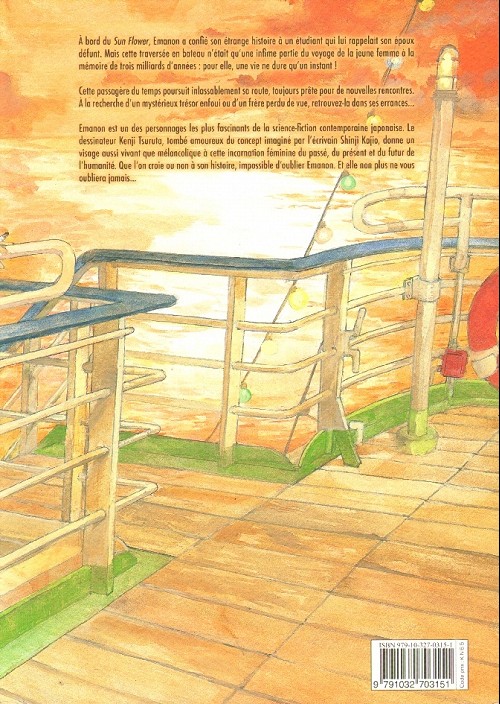 Emanon est un des personnages les plus fascinants de la science-fiction contemporaine japonaise. Le dessinateur Kenji Tsuruta, tombé amoureux du concept imaginé par l’écrivain Shinji Kajio, donne un visage aussi vivant que mélancolique à cette incarnation féminine du passé, du présent et du futur de l’humanité. Que l’on croie ou non à son histoire, impossible d’oublier Emanon. Et elle non plus ne vous oubliera jamais…”