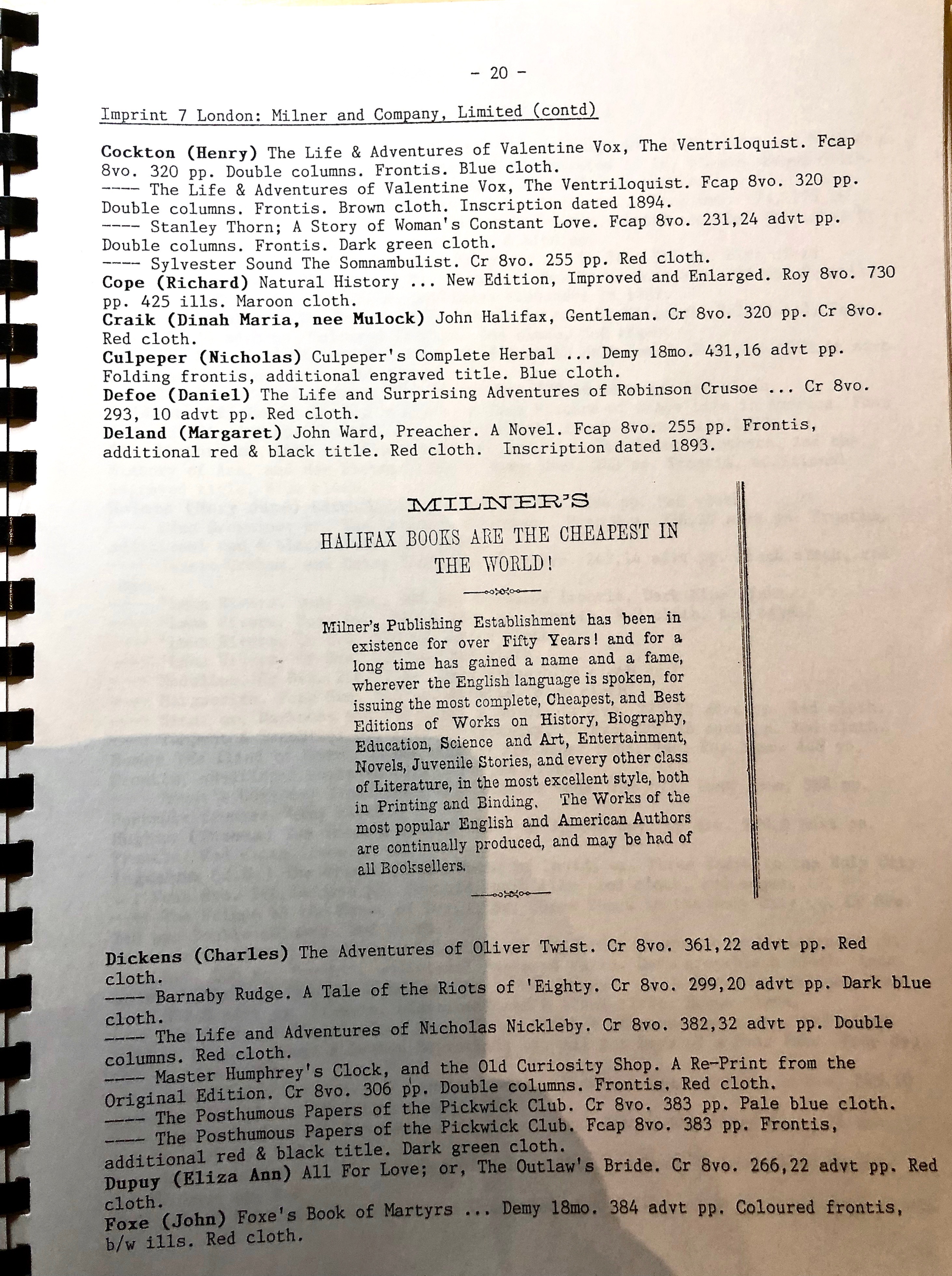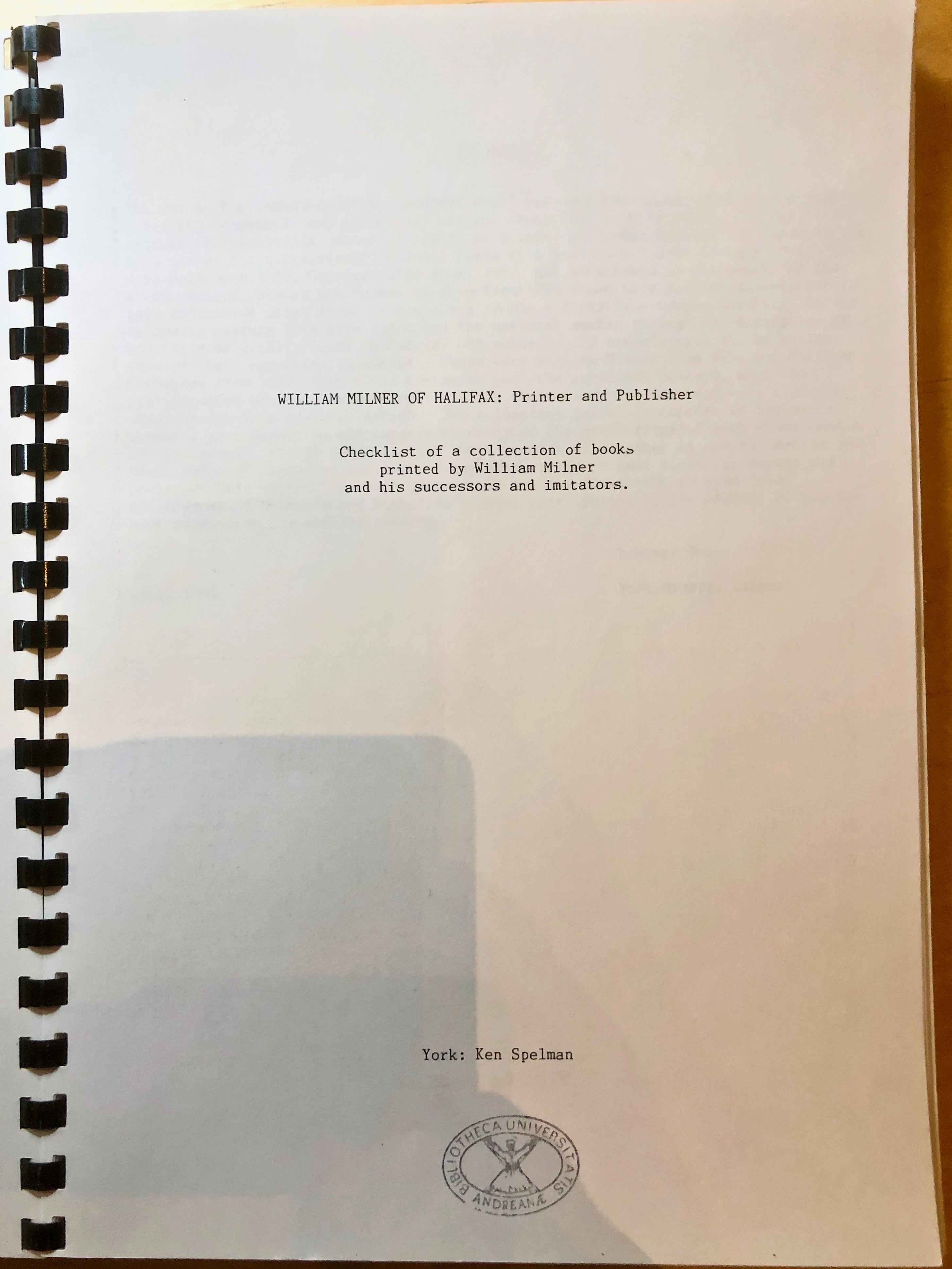 The book title is: “William Milner of Halifax: printer and publisher. Checklist of a collection of books printed by William Milner and his successors and imitators.” The only publishing information is “York: Ken Spelman”. No author is listed on the cover, but the notice from the University of St-Andrews’ library is helpful on that subject: the author is NOT Bernard BARR (who simply wrote the foreword) nor Ken Spelman (the “publisher”, but who was given as author by Amazon) but Peter MILLER and T. FOTHERGILL (who compiled the information).