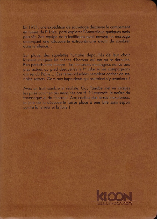 Avec un trait sombre et réaliste, Gou Tanabe met en images les pires cauchemars imaginés par H. P. Lovecraft, le maître du fantastique et de l’horreur. Aux confins des terres inexplorées, la joie de la découverte laisse place à une lutte sans espoir contre la terreur et la folie ! (Texte du site de l’éditeur et de la couverture arrière)