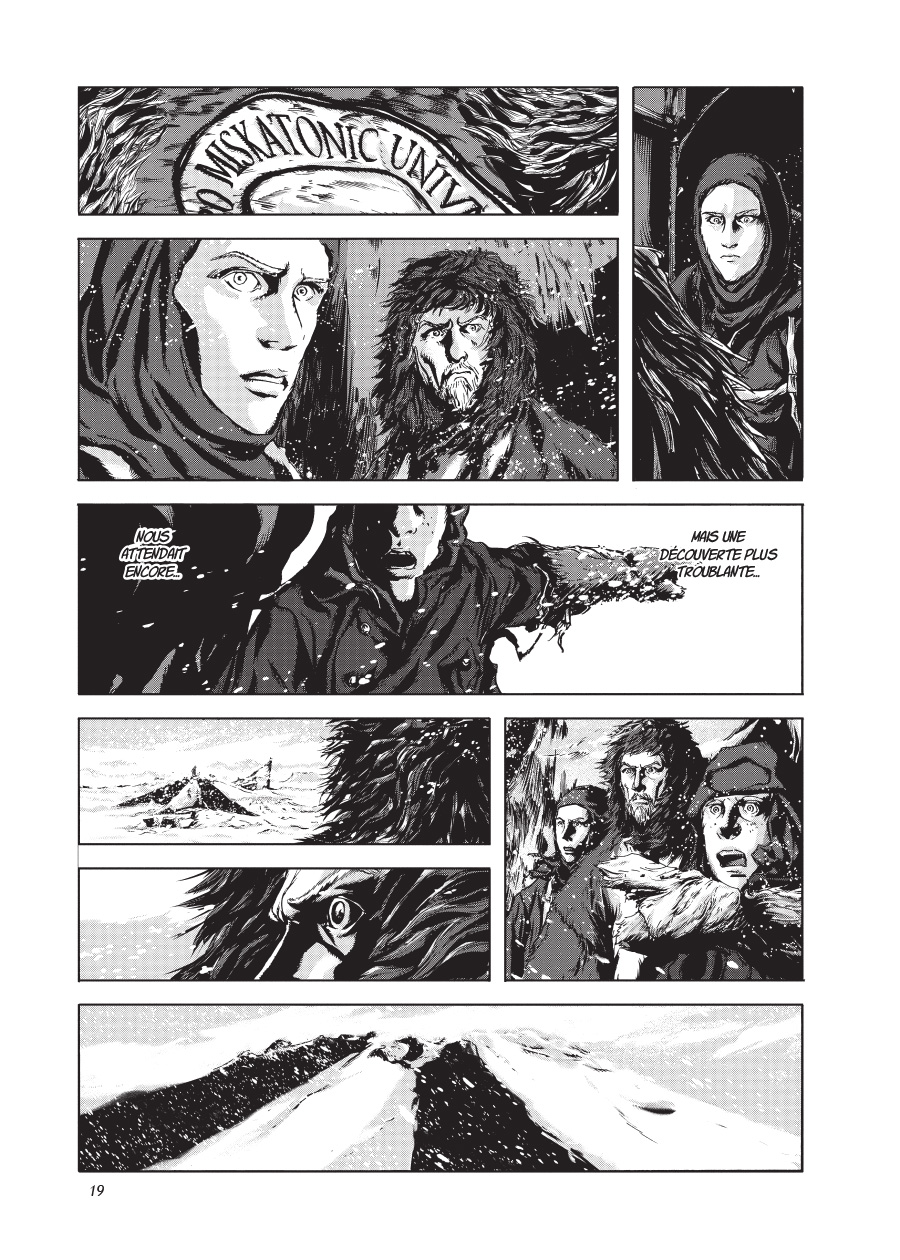 Ce manga est l’adaptation d’un court roman (ou novella) de H.P. Lovecraft (elle-même inspirée par le roman de Edgar Allan Poe, Les aventures d’Arthur Gordon Pym). En 1931, une expédition scientifiques de l’Université de Miskatonic se rend en Antarctique à bord du brick Arkham et de la goélette Miskatonic pour pousser plus loin les explorations de Shackleton, Amundsen, Scott et Byrd. Au-delà des Monts Terror et Erebus, de la chaîne de l’Amirauté et même du Mont Nansen, ils découvrent une chaine de montagnes noires. Ils y trouvent de nombreux fossiles et même, dans une caverne, les restes de créatures incomparables — qui leur rappel un peu la description que le Necronomicon faisait des Grands Anciens! Mais une tempête violente interrompt la communication avec l’équipe de Lake. Après la tempête, Dyer vient à leur rescousse mais découvre le camp anéanti, les membres de l’équipe de Lake étant tous morts et mutilés—sauf un, Gedney, qui semble avoir fuit en traineau à chien. À la recherche de celui-ci, ils montent une expédition pour aller voir ce qu’il y a au-delà des montagnes… Qu’y trouveront-ils? À suivre avec le tome 2!