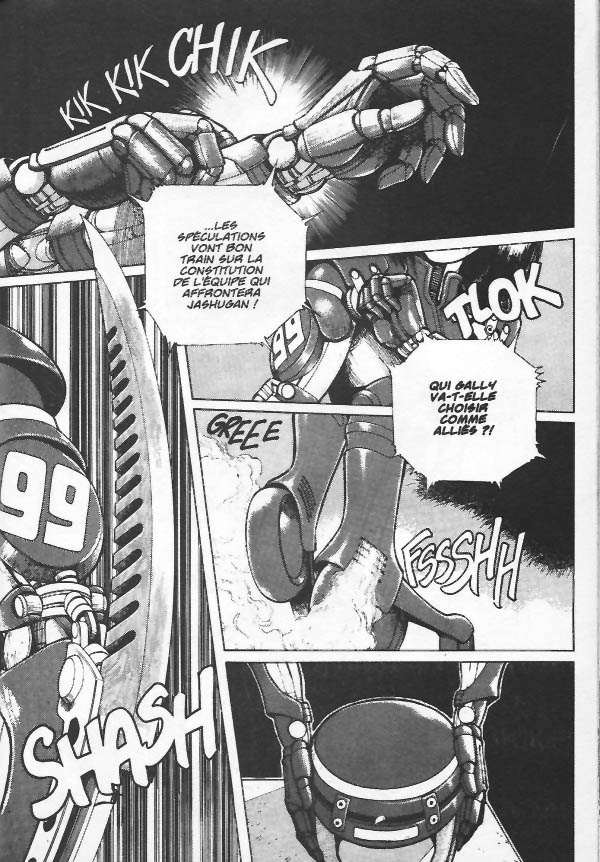 GunnmDeluxe-03-covLe troisième volume de l’édition deluxe (qui recouvre les chapitres dix-sept à vingt-quatre, donc le tome quatre et une partie du tome cinq de l’édition originale) débute avec le match d’ouverture de la seconde ligue de Motorball. Les féroces combats s’étirent sur cent-vingt-trois pages! Gally choisit parmi ces concurrents les membres de l’équipe de challengers qui affronteront avec elle Jashugan: le #88 “King Crusher” Ajakati, le #7 “vent pourpre” Zaphal Takié, le #50 Tigel et le #1 Caligula. Ed fait faire une nouvelle lame pour Gally. Celle-ci se réconcilie avec Ido et décide qu’elle quittera le Motorball après le match contre Jashugan.