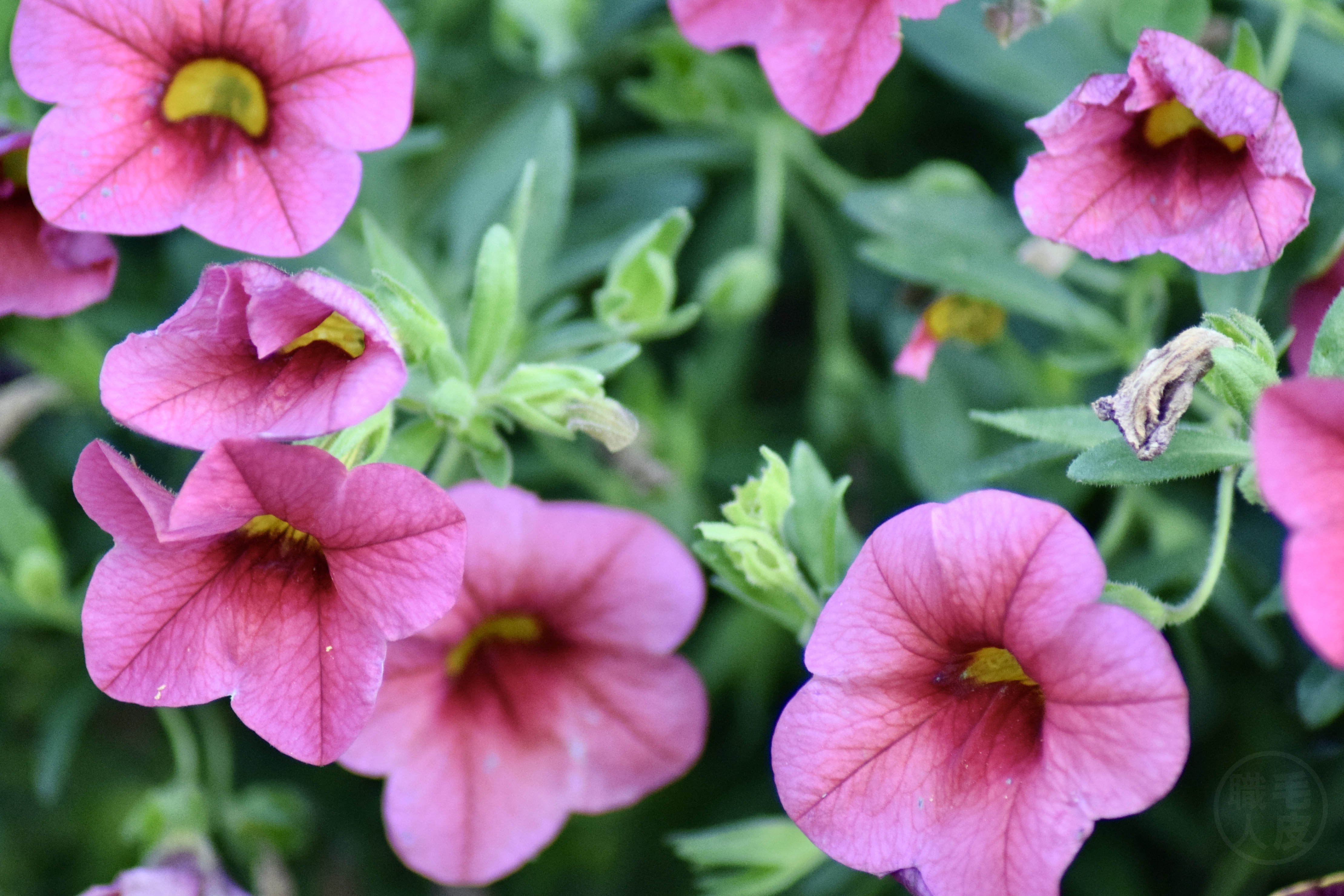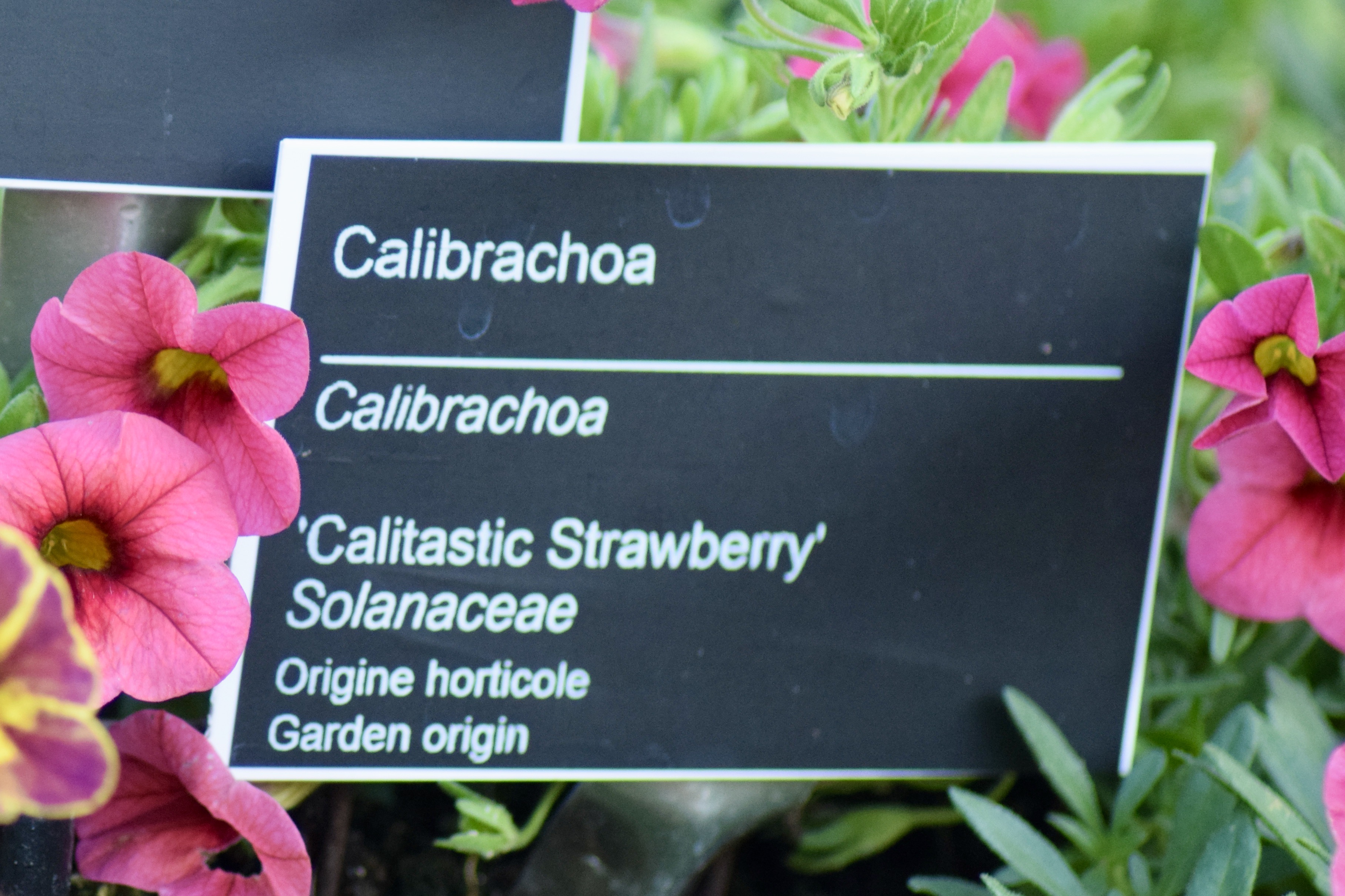 Cette fleur, similaire aux pétunia, est une plante herbacées pérennes de la classe des Magnoliopsida, de l’ordre des Solanales, et de la famille des Solanaceae. Le genre Calibrachoa se divise en une vingtaine d’espèces. Dans ce cas-ci (malheureusement la fiche signalétique ne précise pas les détails) il s’agit d’une hybride (Calibrachoa x hybrida) appartenant au cultivar “Calitastic Strawberry”. C’est une plante ornementale que l’on retrouve surtout en pots ou en paniers suspendus et qui est fort appréciée des colibris et des papillons. [Sources: Wikipedia et plusieurs sites horticoles] [ Translate ]