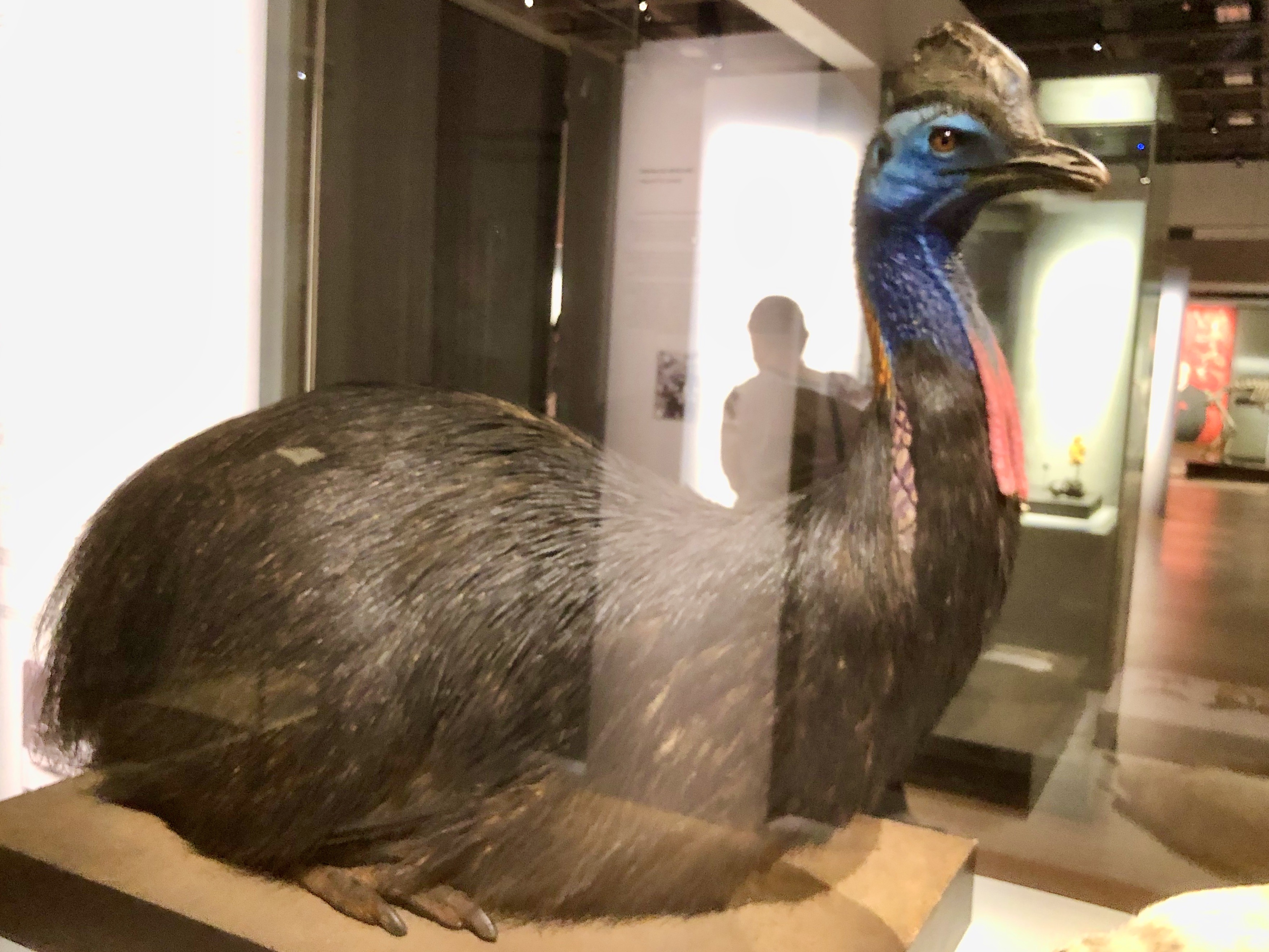 Nous restons dans le domaine des grands oiseaux… Ce specimen naturalisé de casoar à casque (southern cassowary), un grand oiseau coureur de l’Australie et de la Nouvelle-Guinée, appartenait à Walter Rothschild qui les élevait à sa résidence de Tring Park (Hertfordshire) [d’après la fiche signalétique du musée]. C’est une espèce d’oiseau de la famille des Casuariidae et du genre Casuarius.