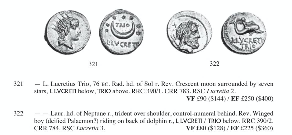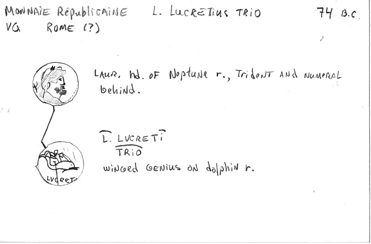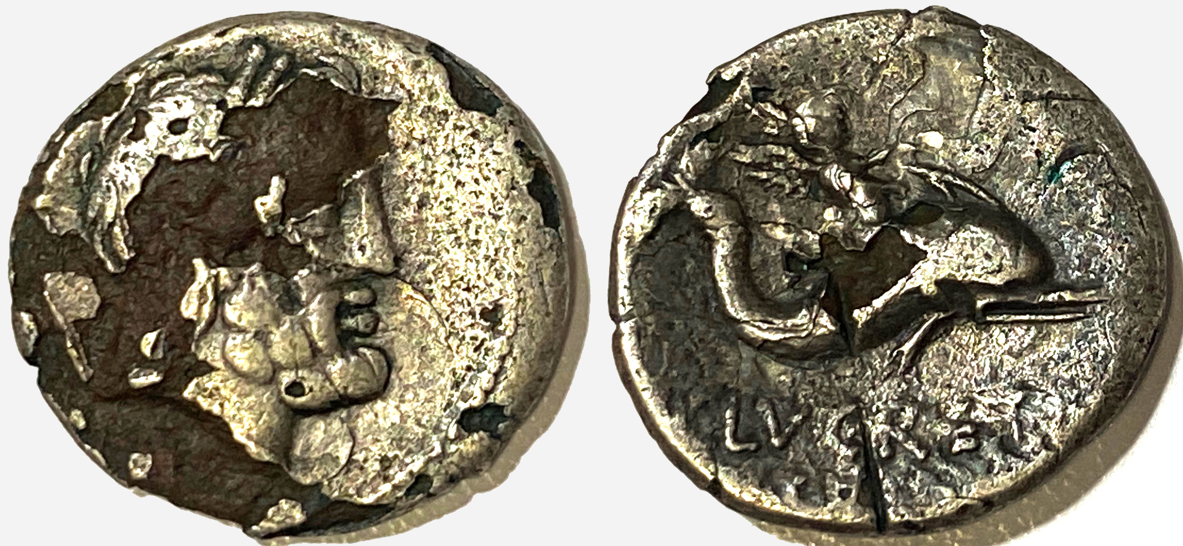Cette pièce est endommagée et une partie des inscriptions est donc illisible. Par contre, en comparant à d’autres pièces similaires, on peut les deviner. Sur l’avers, derrière la tête de Neptune, on peut deviner le manche d’un trident. Aucune inscription n’est apparente mais le champs derrière la tête devrait comporter un chiffre dénotant la valeur de la pièce ou un numéro de contrôle de cette série de frappe. Sur d’autres pièces similaires, on retrouve X, XVI mais aussi des chiffres allant de I à LXXIV (où le L est remplacé par un L ou un T inversé). Sur le revers on peut lire distinctement “LVCRETI” mais on devine à peine le L qui précède, le I qui suit, et le TRIO en dessous. Toutefois, tous les indices sont là pour nous permettre d’identifier et de dater la pièce sans le moindre doute. Par contre, comme pour la pièce précédente, SEAR date la pièce en 74 AEC dans son édition de 1983 (RCV (83): 251) mais l’édition de 2000 (Sear RCV (M)) situe la date en 76 AEC et les autres sources concordent avec cette dernière datation.