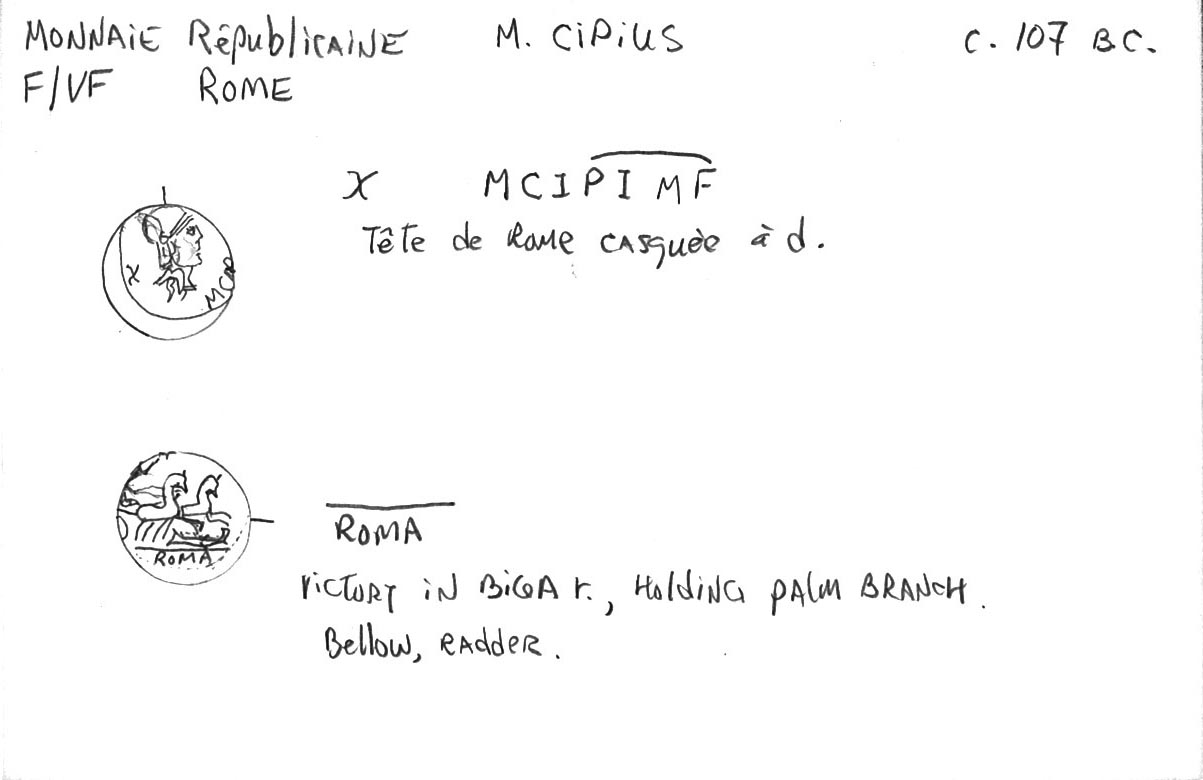 Obv.: Helmeted head of Roma right; M•CIPI•M•F before, X (mark of value) behind