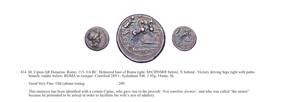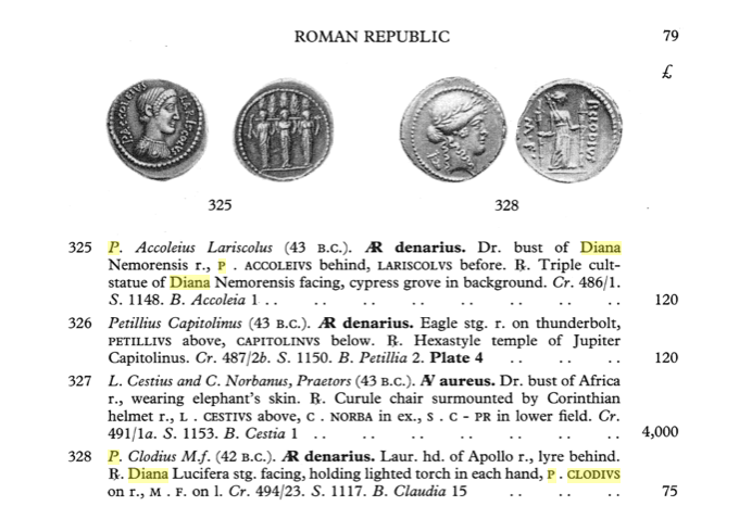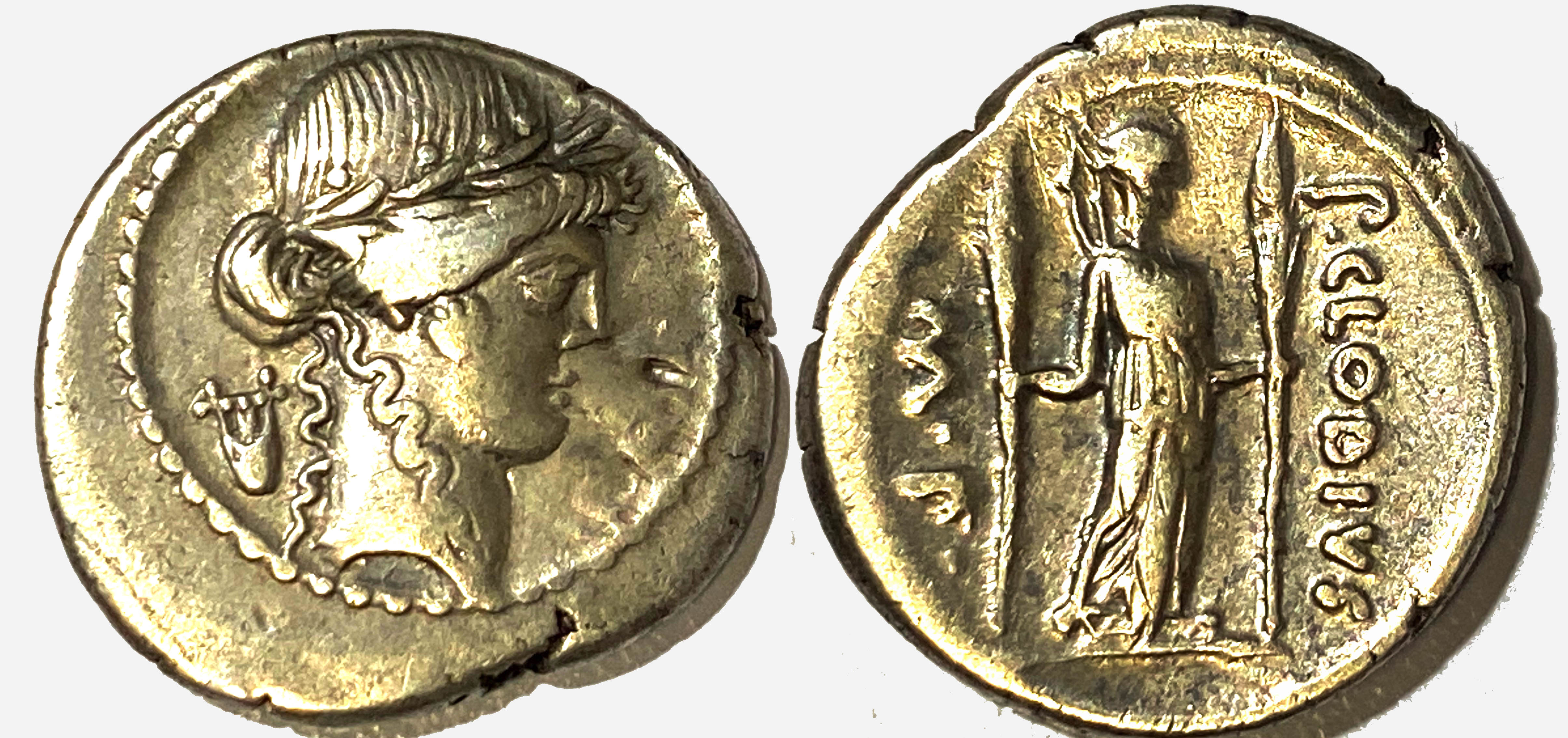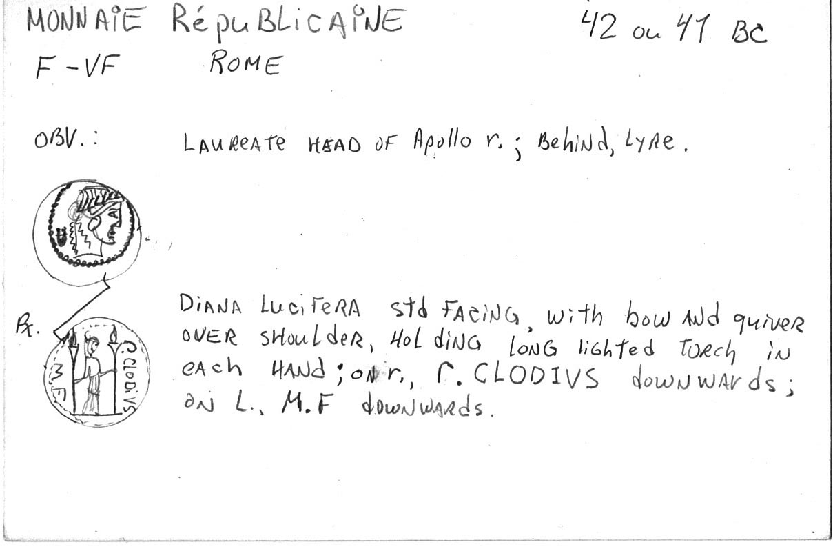 Comme pour les pièces de M. CIPI et de L LVCRETIVS TRIO, celle-ci est également une pièce républicaine cette fois frappée par le magistrat monnayeur (triumvir monétaire — d’où la titulature “M.F.” ?) P CLODIVS qui nous est inconnu sinon qu’il a tenu cet office en 42 AEC (une source le cite comme étant P. Clodius M.f. Turrinus). Comme pour les pièces précédentes, la datation a changée avec les années puisque SEAR date la pièce en 41 AEC dans son édition de 1983, puis en 42 AEC dans les éditions plus récentes.