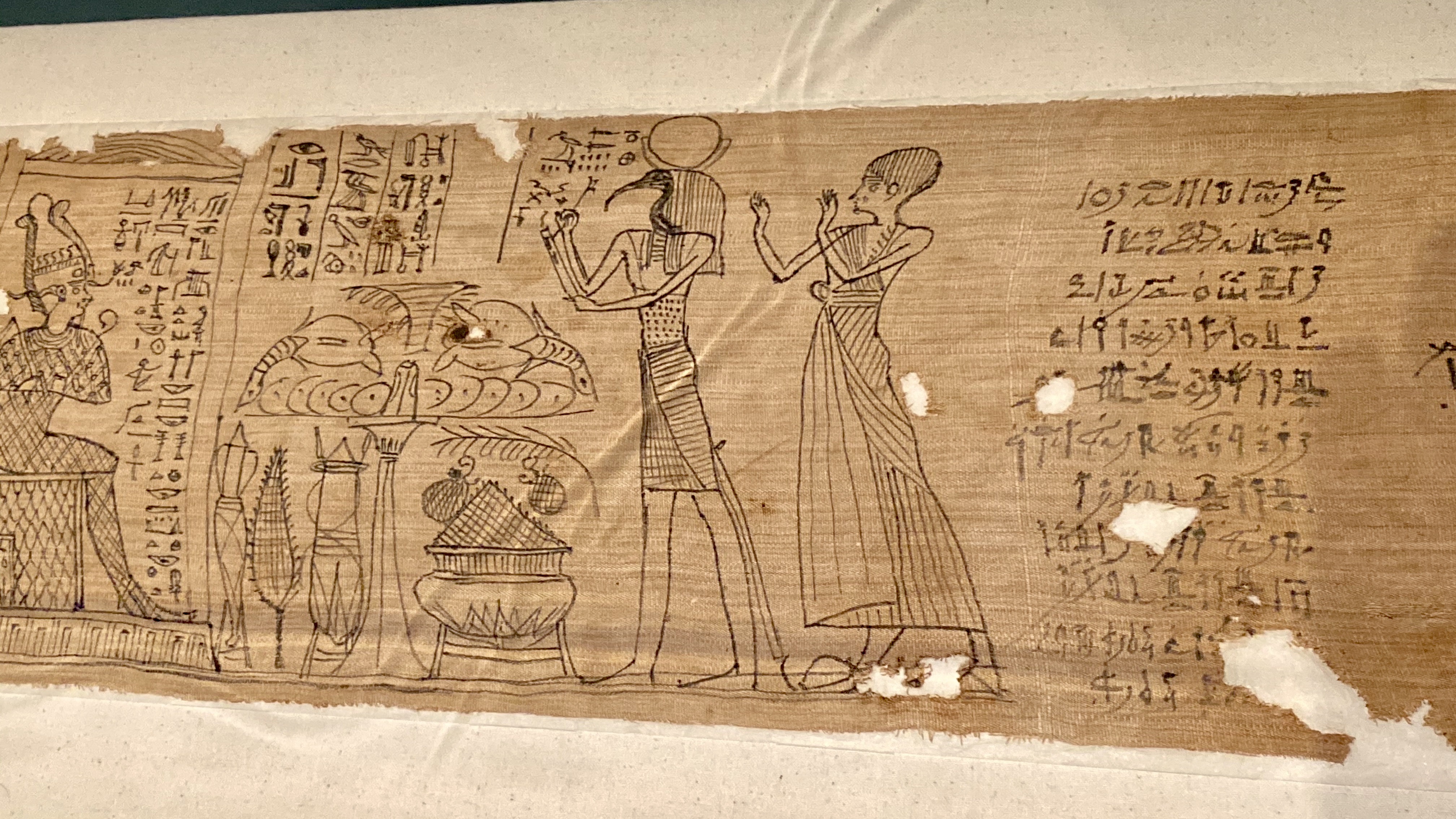 Ici nous passons des sciences naturelles aux sciences tout court avec cette image d’un fragment (de quatre mètres de long !) d’une bandelette funéraire inscrite de formules incantatoires et d’illustrations tirées du livre des Morts. Selon la fiche signalétique, elle date de l’Époque Ptolémaïque (c. 332-250 AEC) ce qui lui donne environ 2300 ans ! Fascinant ces égyptiens…