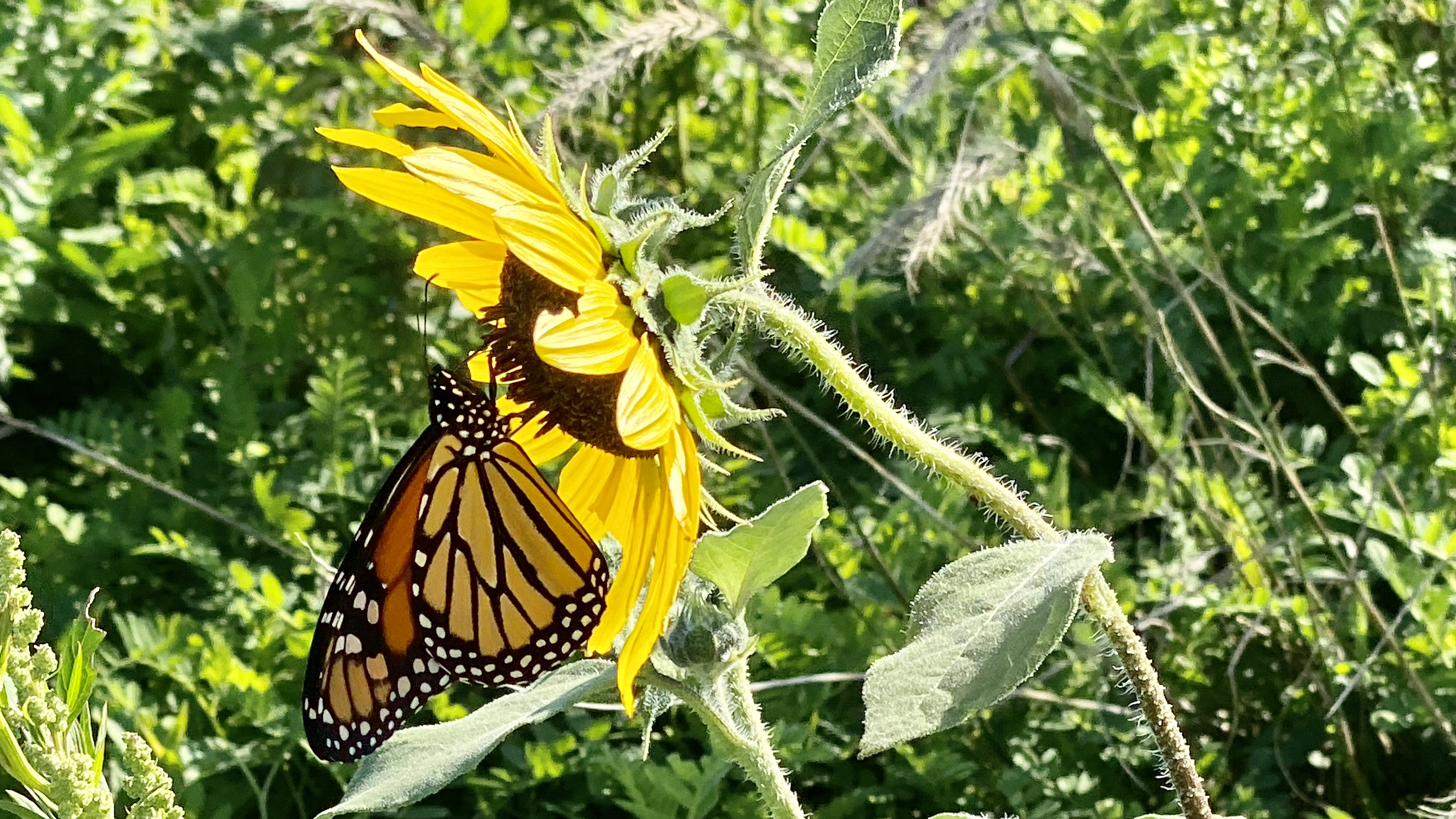 Un monarque (Danaus plexippus, Monarch en anglais) butinant sur un tournesol (Helianthus annuus, sunflower en anglais). C’est un insecte de l’ordre des Lepidoptera, de la super-famille des Papilionoidea, de la famille des Nymphalidae, de la sous-famille des Danainae et du genre Danaus. C’est vraiment un superbe papillon qui effectue une migration sur de très longue distance.
