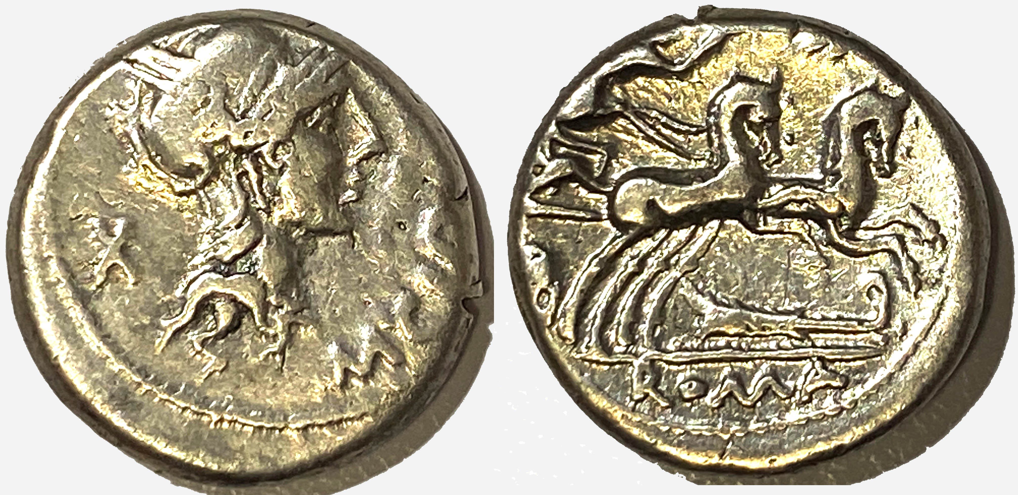 Dans la première moitié du IIe siècle AEC, le denier d’argent a une valeur de dix as (denarius veut justement dire “dizaine” et aes veut simplement dire “bronze”), d’où le symbole “X” (chiffre romain 10) qui apparait à gauche du champs de l’avers et qui dénote la valeur de la pièce. Dans la deuxième moitié du IIe siècle (vers 140 AEC) et au 1er siècle AEC, le denier sera dévalué à seize as (indiqué par le symbole “XVI” ou “X”) mais, selon PINK, il semble que le symbole “X” a continué à être utilisé pour une certain temps. Il nous apprend aussi que le magistrat principal supervisait la frappe des pièces de bronze et que ses deux collègues s’occupaient des pièces d’argent.