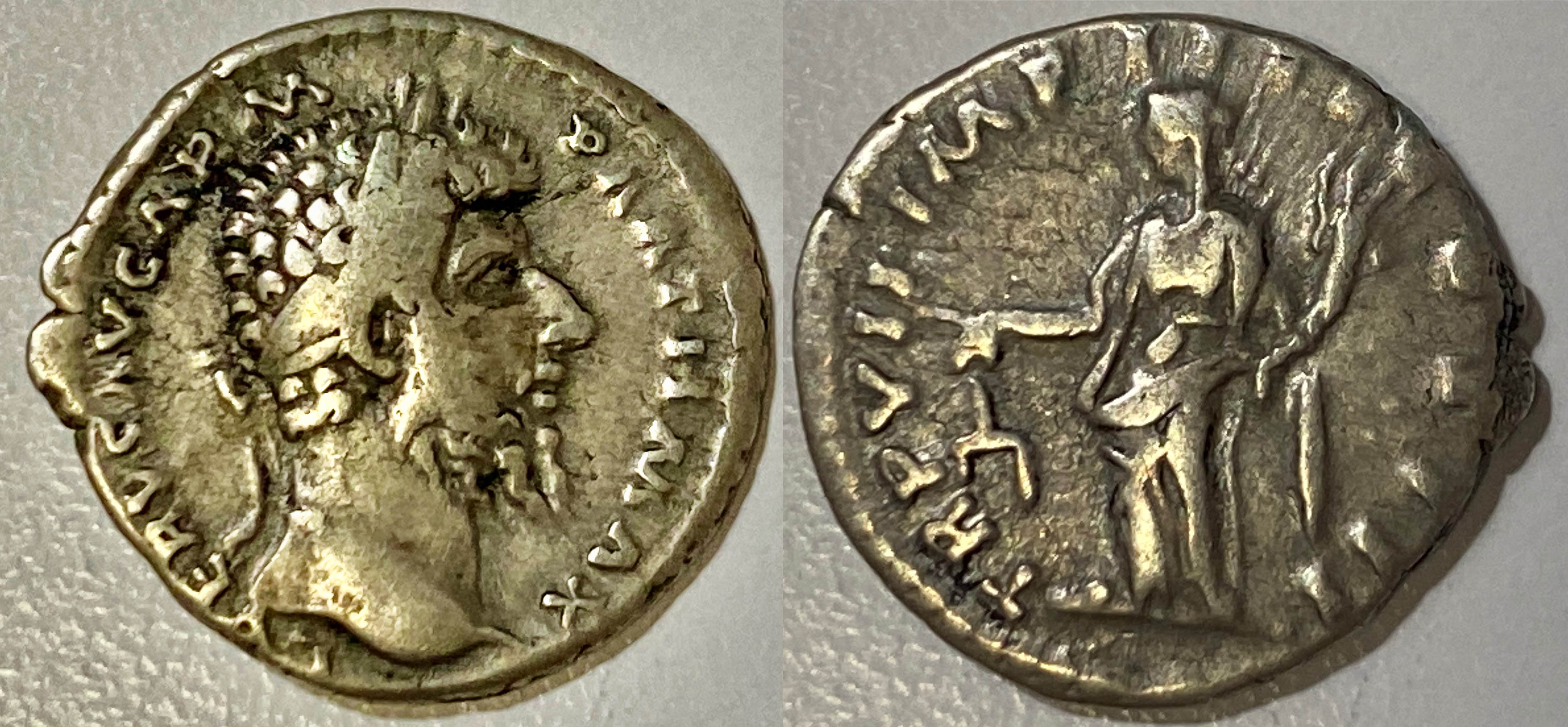 Celle-ci est définitivement l’une de mes favorites. C’est un denier d’argent de Lucius Verus, co-empereur avec Marcus Aurelius. L’identification est facile grâce à la nomenclature (L VERVS AVG) et la titulature (ARM PARTH MAX d’une part, et TR P VII IMP IIII COS III d’autre part) nous permet une datation assez précise. On y apprend que Verus est le grand vainqueur des Arméniens et des Parthes, qu’il a reçu pour une septième fois (en Déc. 167) le pouvoir tribunaire (Tribunitia Potestas), pour une quatrième fois (en 166) le titre d’Imperator et celui de consul pour une troisième fois (en 167). Comme il reçoit le pouvoir tribunaire une huitième fois en décembre 168 et qu’il est acclamé Imperator une cinquième fois fin 167 ou début 168, on peut dater la pièce entre décembre 167 et février 168. Fascinant, n’est-ce pas?