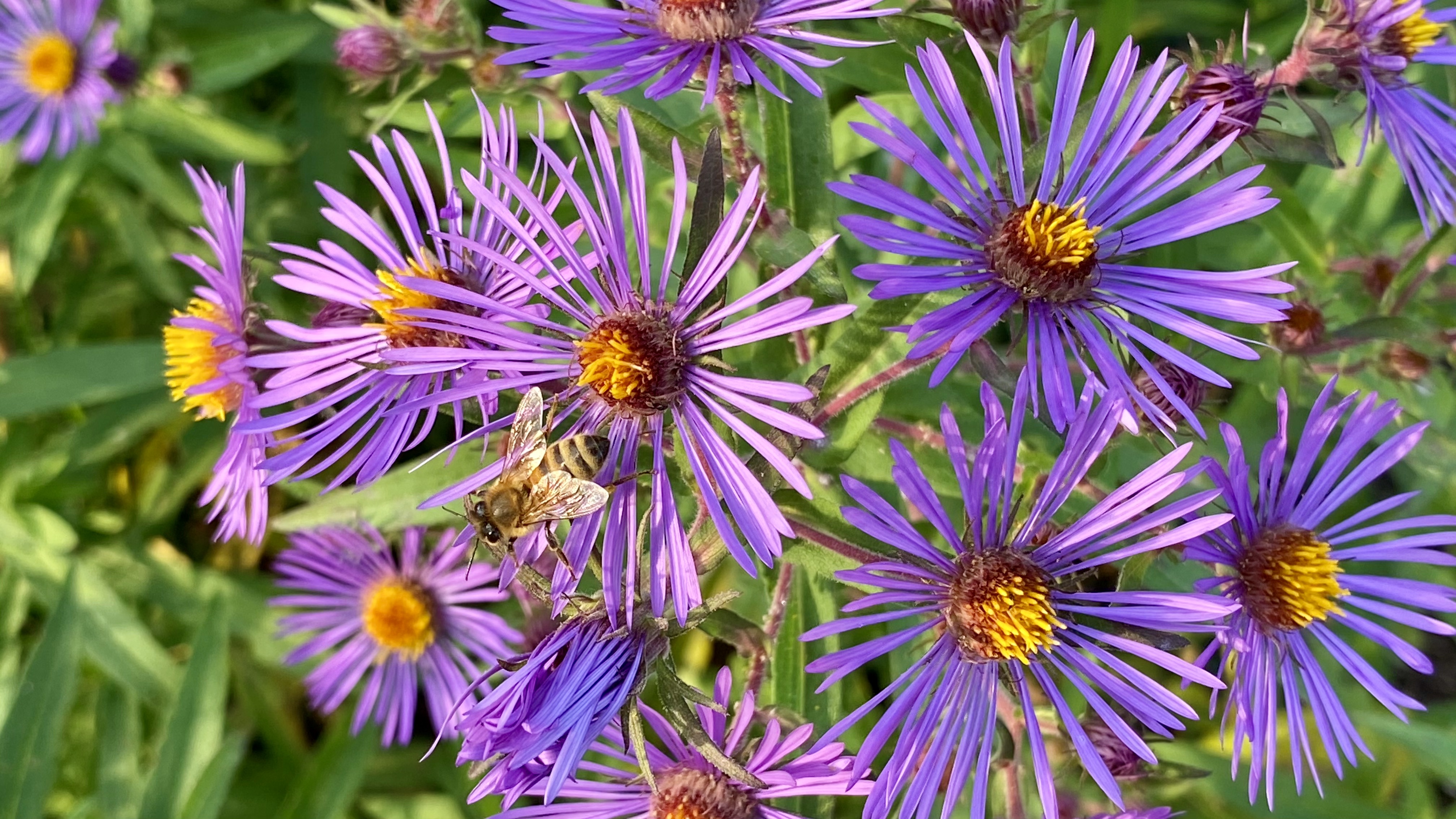L’aster de Nouvelle-Angleterre (New England aster en anglais) n’est en fait plus considéré comme une aster car sa nouvelle taxonomie est Symphyotrichum novae-angliae. On l’appel parfois marguerite de la Saint-Michel (Michaelmas daisy en anglais) parce qu’elle fleurit autour de l’ancienne fête religieuse de Saint Michel Archange le 29 septembre — toutefois c’est aussi le nom de la variété Européenne Aster amellus, avec laquelle on la confond souvent. C’est une plante herbacée à fleurs de l’ordre des Asterales, de la famille des Asteraceae, et du genre Symphyotrichum (qui compte une cinquantaine d’espèces alors que le genre Aster lui en comporte plus de six-cent !). Dans le language des fleurs, elle représente le mois de septembre. On en retrouve plus de soixante-dix cultivars différents. Les autochtones d’Amérique en faisaient de nombreux usages médicinaux (en cataplasme, en infusion et fumée).
