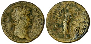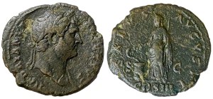 Finalement, ce superbe sesterce nous offre sur l’avers la tête d’Hadrien laurée, regardant à droite, avec l’inscription HADRIANVSAVG[USTVS] CO[N]S[UL] III P[ATER] P[ATRIAE]. Hadrien a reçu le titre d’Auguste lors de son accession au pouvoir en 117, son troisième consulat en 119 et le titre de Père de la Patrie en 128. La pièce a donc été frappée après cette dernière date.