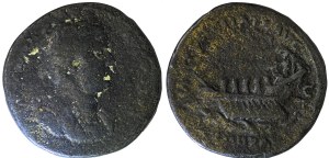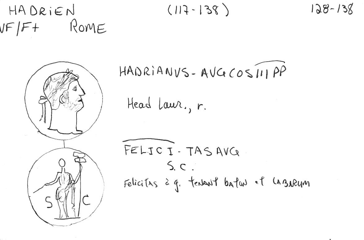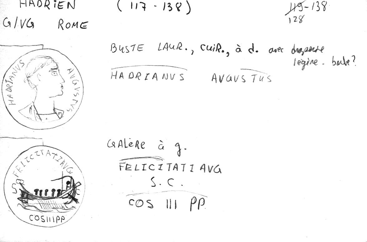 Ce sesterce (bronze?, 31 x 32 mm, 23.278 g) nous offre sur l’avers un buste lauré (drapé?) et cuirassé d’Hadrien, à droite, avec la probable inscription HADRIANVSAVGVSTVS. Le revers est plus lisible et intéressant avec la représentation d’une galère à gauche (au-dessus des vagues, cinq rameurs avec un timonier [hortator] à la poupe sous un abris, devant l’acrostolium, et flanqué d’un enseigne [signum] et d’un étendard [vexillum]; à la proue, un mât et une voile repliée), surmontée de l’inscription FELICITATI AVG[VSTI] (pour le succès ou la bonne fortune de l’Auguste), flanquée de chaque côté de S – C (Senatus Consulto, “avec la permission du Sénat”) et de COS III (consul tertium) P P (Pater Patriae) en exergue. Hadrien ayant reçu le titre de Père de la Patrie seulement en 128, la pièce doit donc être postérieure à cette date. Certaines des sources en lignes (vcoins, vcoins, CoinArchives, acsearch, cointalk, British Museum) datent la pièce de 129-130, d’autres de 132-134/5 car cela correspondrait à la période où Hadrien parcours l’empire (à Athènes et en Asie [Syrie, Égypte] de 129 à 133, en Judée de 133 à 134). Il semble difficile d’établir quelle variante (tête vs buste, drapée ou cuirassée, nombre de rameurs et gréements de la galère) correspond à quelle date. Je l’ai acquise pour environ $5 (1985/01/06). (Autres Réf.: Sear RCV (83): 1013; RIC 706). Voir aussi ma fiche.