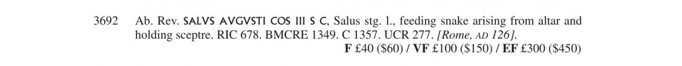L’as (bronze, 26 x 28 mm, 9.591 g) nous offre sur l’avers un buste d’Hadrien lauré à droite, l’épaule gauche légèrement drapée, avec l’inscription HADRIANVSAVGVSTVS. Sur le revers on retrouve une Salus (Santé) drapée, debout à gauche, tenant un sceptre de la main gauche et une patère de la main droite avec laquelle elle nourrit un serpent enroulé autour d’une colonne ou d’un autel. L’inscription est SALVS – AVGVSTI (santé de l’Auguste) avec un S – C (Senatus Consulto) dans le champs et un COS III (consul tertium) en exergue. Hadrien a obtenu le titre d’Auguste à son accession au pouvoir le 11 août 117 et le consulat pour une troisième et dernière fois en janvier 119. La pièce est donc postérieure à ces dates. Les sources consultées en ligne (CoinArchive, Numista) la date soit de 125-126/7 ou 125-128. David R. Sear (Sear RCV (M): 3692) la date plus spécifiquement à 126 EC. Je l’ai acquise pour $10.75 le 1985/11/18. (Autres Réf.: C1367; RIC 678, RIC II.3 828). Voir aussi ma fiche.