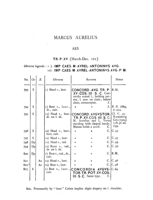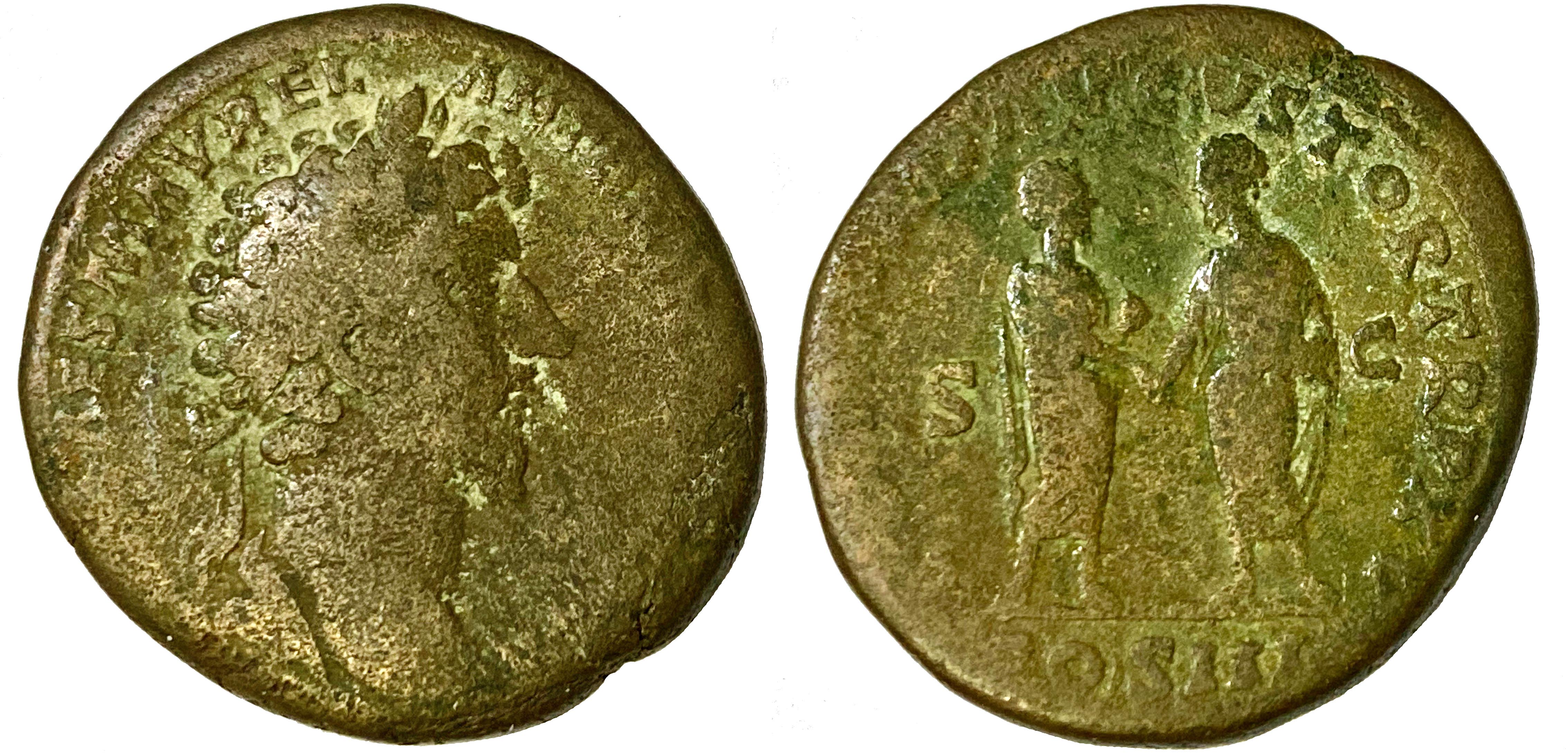Il est important de noter que je n’ai trouvé dans les références aucunes autres pièces qui correspondent exactement à ce sesterce. Toutes les variantes présentent sur cette pièce se retrouvent sur d’autre types mais jamais ensemble. Et je suis pas mal sûr de ne pas me tromper: la tête de Marcus est bel et bien laurée car on voit clairement les lauriers qui dépassent sur le dessus de sa tête et les cordons qui l’attachent derrière. On voit aussi clairement un drapé sur son épaule. Les titulatures datées (TR P XV, COS III) sont également sans ambiguïté. Et cette pièce, par son poids et sa taille, est définitivement un sesterce. Pourtant, dans les références, je ne retrouve ce type de pièce qu’avec la tête nue (non laurée), avec un différent revers (où les empereurs sont assis et non debout), avec une autre date (TR P XVI) ou sur un as. Ma pièce serait-elle rare ?