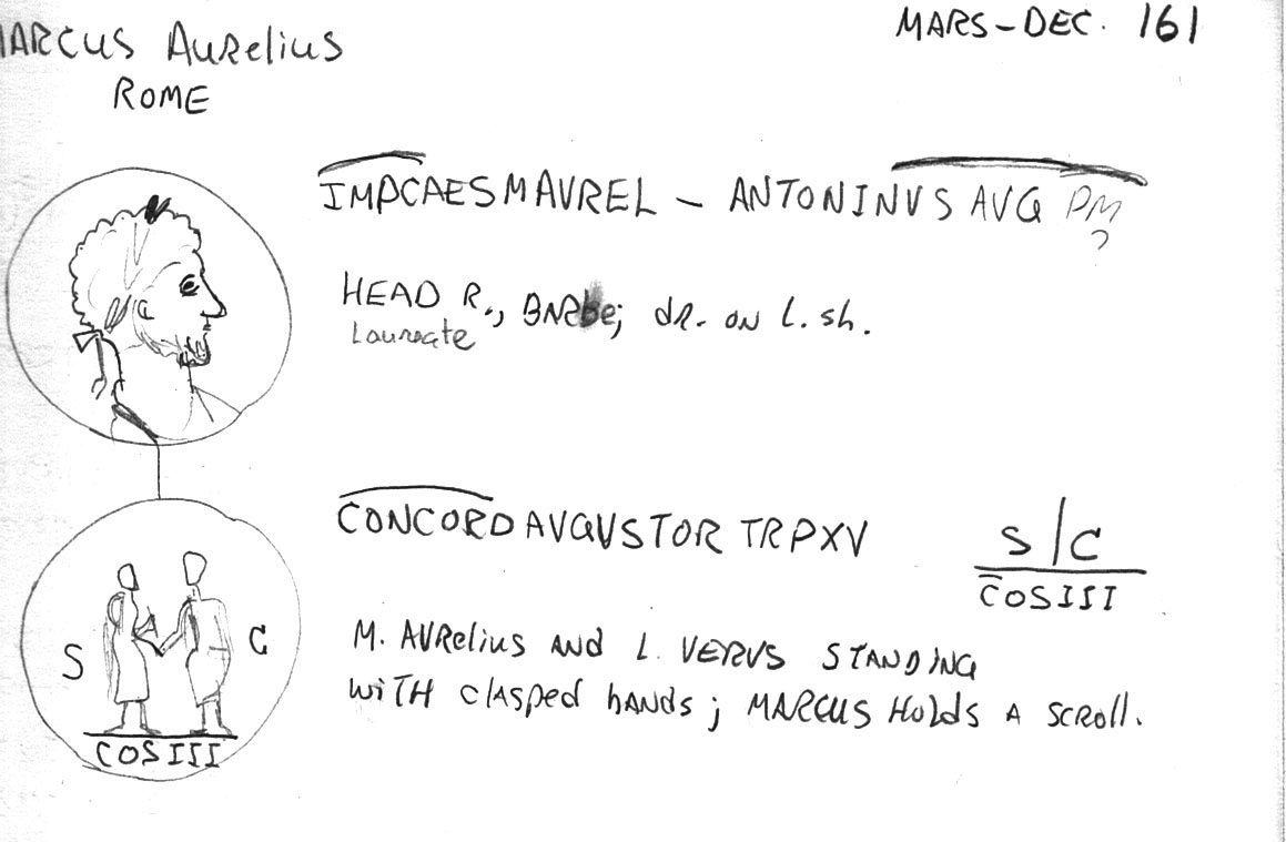 La représentation du revers est très intéressante car elle célèbres l’accession des deux co-empereurs, Marcus et Lucius, qui sont illustrés se serrant la main. L’inscription “concorde des augustes” souligne d’ailleurs le fait que cette accession se fait dans l’harmonie et la bonne entente. Elle se fait aussi “avec la permission du sénat” [S-C]. À la mort d’Antonin, le sénat aurait préféré acclamé Marcus comme unique successeur mais, celui-ci hésitant à prendre une telle responsabilité seul (il aurait sans doute aimé continuer ses études philosophiques), il insista pour que l’honneur soit accordé aussi à son frère adoptif, Lucius, en accordance avec le désir d’Hadrien. L’hésitation du sénat était compréhensible puisque c’était la première fois dans l’histoire de Rome que deux empereurs régnaient conjointement, avec les même pouvoirs (quoi que, en théorie, Marcus avait prédominance puisqu’il était le seul à détenir le titre religieux de Grand Pontife).