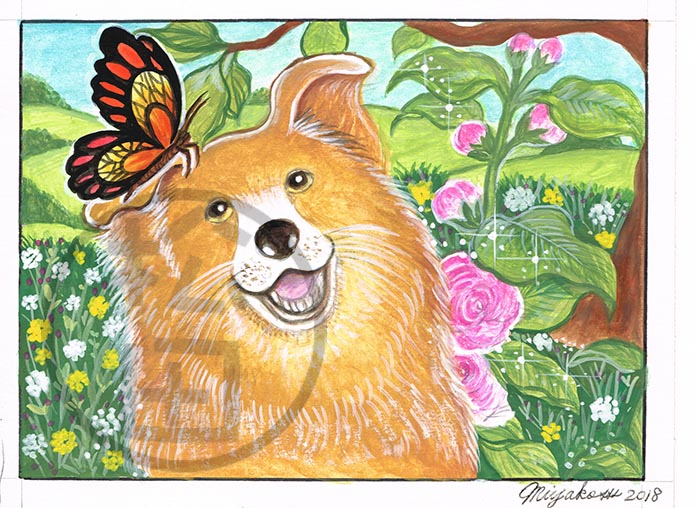 Alcea Rosea, Brown Dog and a Butterfly