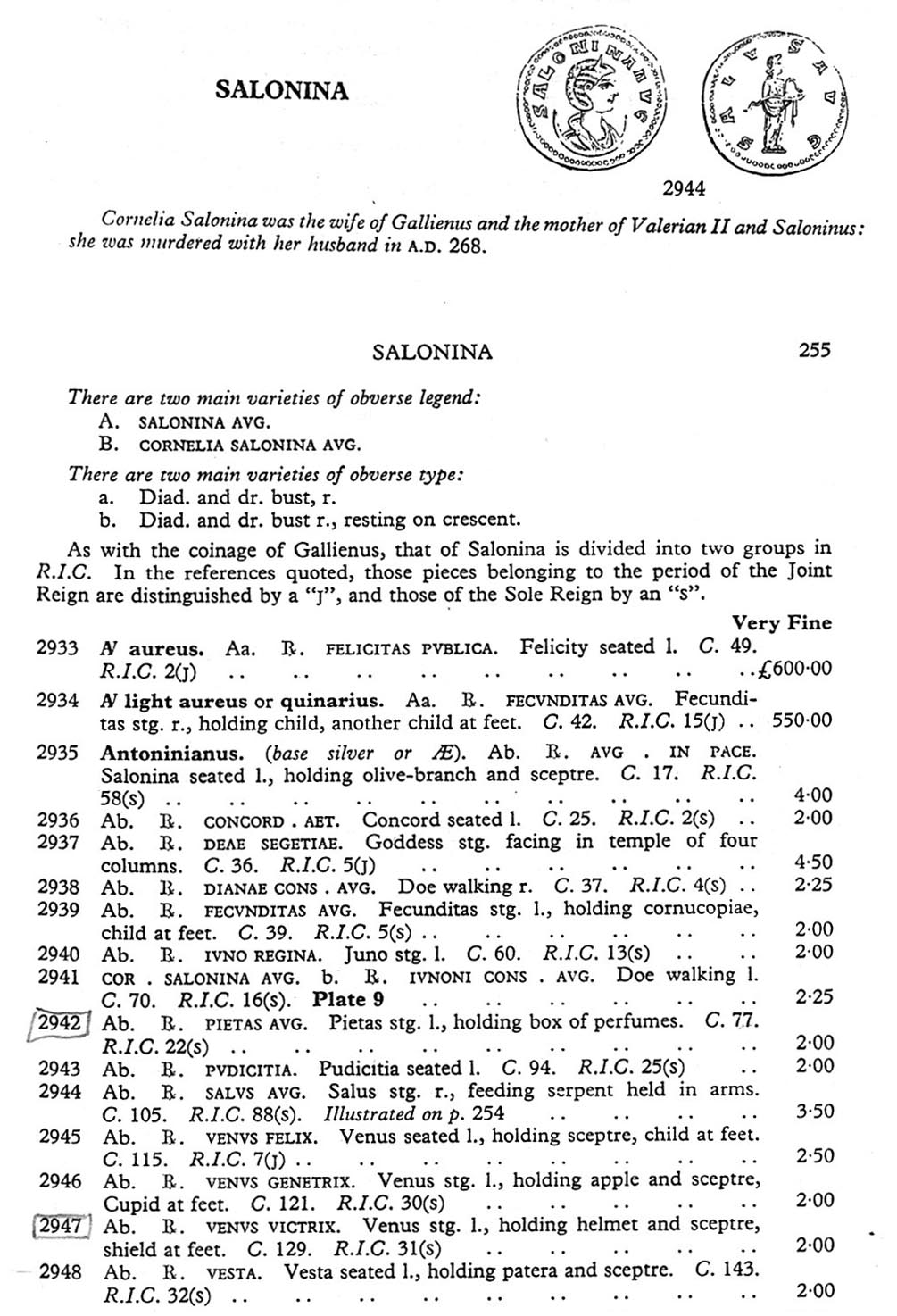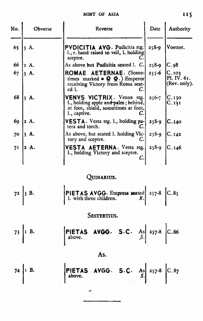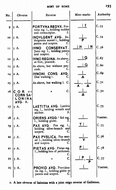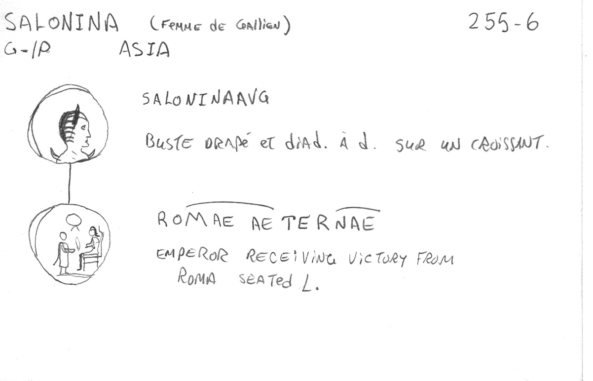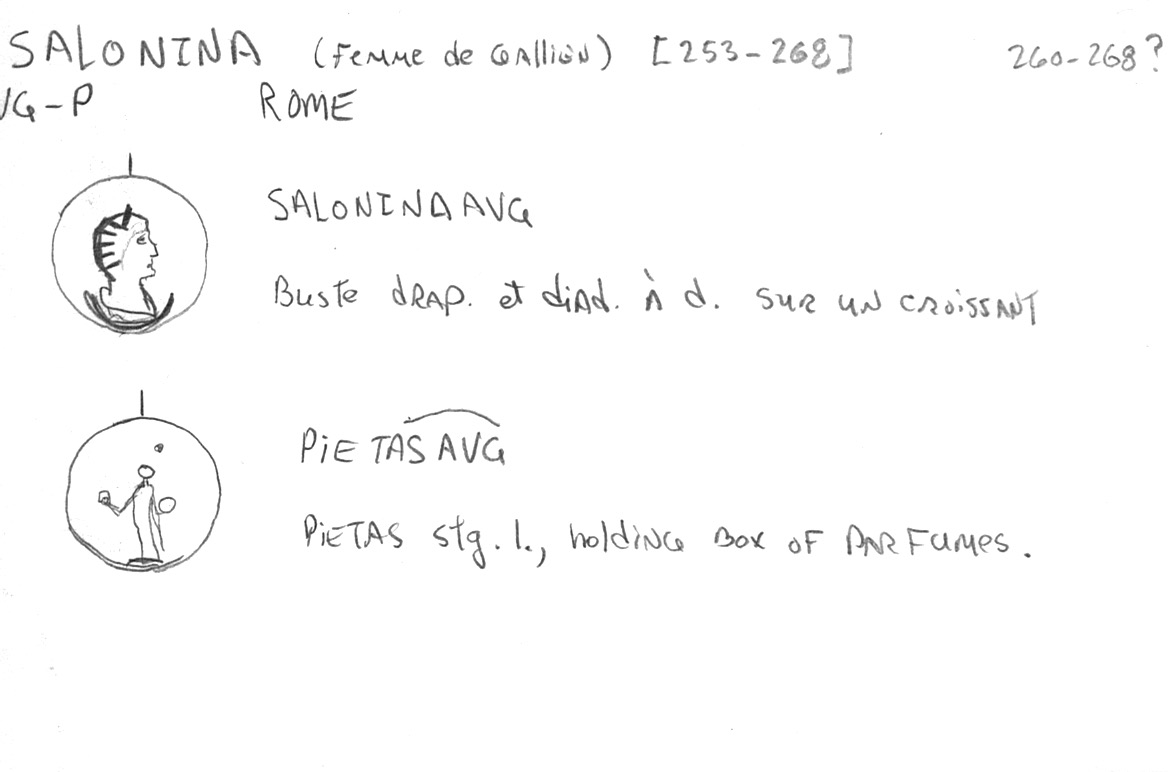 Sources: Wikipedia, RIC 5a: 22 (p. 193), Sear RCV (1983): 2942, C 77, vcoins, Wildwind (text, image), numismatics, Gallienus & family, ERIC, FAC (Salonina, Pietas). Voir aussi ma fiche.