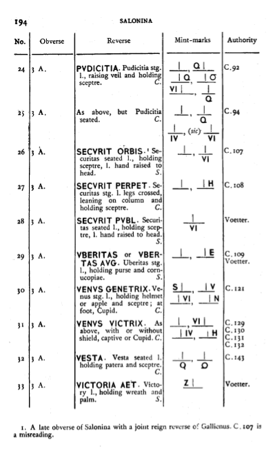 Sources: Wikipedia, RIC 5a: 31 (p. 194), Sear RCV (1983): 2947, C 129, vcoins, Wildwinds (text, image), Wildwinds (text, image), Numista, Numista, numismatics, Gallienus & family, ERIC, FAC (Salonina, VENVS VICTRIX, billon). Voir aussi ma fiche.