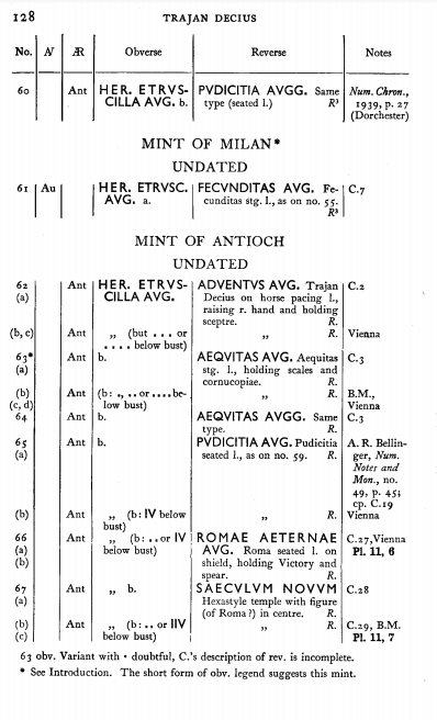 Sources: Wikipedia, RIC 5a: 67 (p. 115), C 103, vcoins, CoinArchives, numiscmatics, ma-shops, Wildwinds (text, image), Wildwinds (text, image), acsearch, acsearch, acsearch, ERIC, FAC (Salonina, Romae Aeternae). Voir aussi ma fiche.