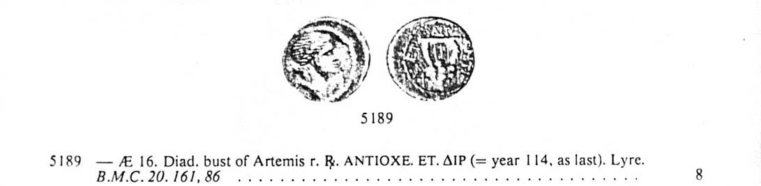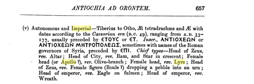 En procédant par comparaison, j’ai trouvé que ce type semble surtout prévalent à Antioche (province de Syrie, Seleucis et Pieria) — mais il n’y est cependant pas exclusif puisqu’on le retrouve dans d’autres cités comme Megara (selon HEAD, p. 329, mais il s’agit de pièces en argent datant du IIIe siècle AEC; il en recense également à Thera, Myrina, Mytilene, etc.). L’inscription de l’avers serait soit ΑΝΤΙΟΧΕΩΝ (Antiocheon / “[émis] par le peuple d’Antioche”) ou ΑΝΤΙΟΧΕΩΝ ΜΗΤΡΟΠΟΛΕⲰϹ (Antiocheon Metropoleus / “[émis] par le peuple de la cité d’Antioche”). L’inscription sur le revers serait ETO ou ETOY (abréviation de ETOYΣ (έτος) / “année”), le 𝜞 serait une marque d’officine (la troisième officine, celles-ci étant numérotées A, B et C) et le 𝜪 daterait la pièce de 21/22 EC (𝜪 = 70; 70 + -48/49 [début de l’ère Césarienne] = 21/22) soit la neuvième année du règne de Tiberius. Toutefois la plupart des exemples de ce genre de pièces (tant dans les références en ligne [Wildwinds, RPC] que bibliographiques [HEAD, p. 657 ou WROTH. p. 163-64]) sont plus tardives, avec des datations comme “ZOP” (177 = 128/29), sous Hadrien. Ce pourrait-il que les premiers et derniers caractères de la date aient été effacé ne laissant que le “O” de visible? Cela ne semble pas le cas. Et si j’ai vu des pièces similaires (Artemis / Lyre; cf. SEAR #5189 et WROTH, p. 161) datant du règne de Néron (𝝙I𝝦 = 114 = 96 EC), je n’ai trouvé aucun exemple de pièce datant de l’époque de Tibère. Malgré tout, si ce n’est pas une certitude, je continue à croire que ma pièce date de cette époque. C’est peut-être une pièce rare?