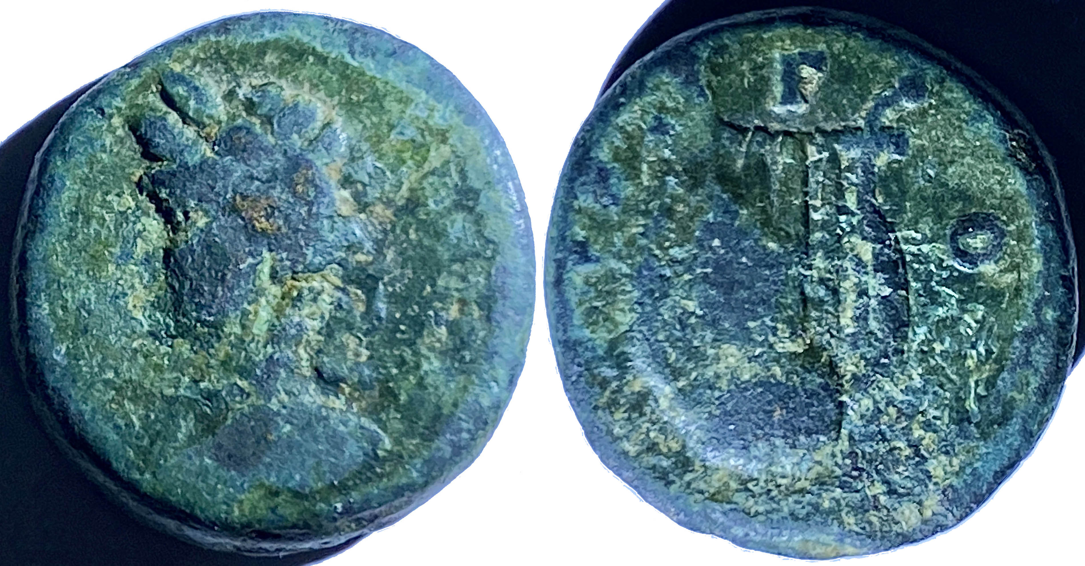 Je n’ai pas de pièce de Tiberius proprement dite mais j’ai une pièce grecque impériale que je crois avoir été frappée sous son règne… (Quoique, après vérification, je n’en suis plus si sûr. C’est le problème avec l’identification des pièces anciennes: parfois on ne pourra jamais obtenir une identification et une datation avec certitude. Je vous parle tout de même de Tiberius…)